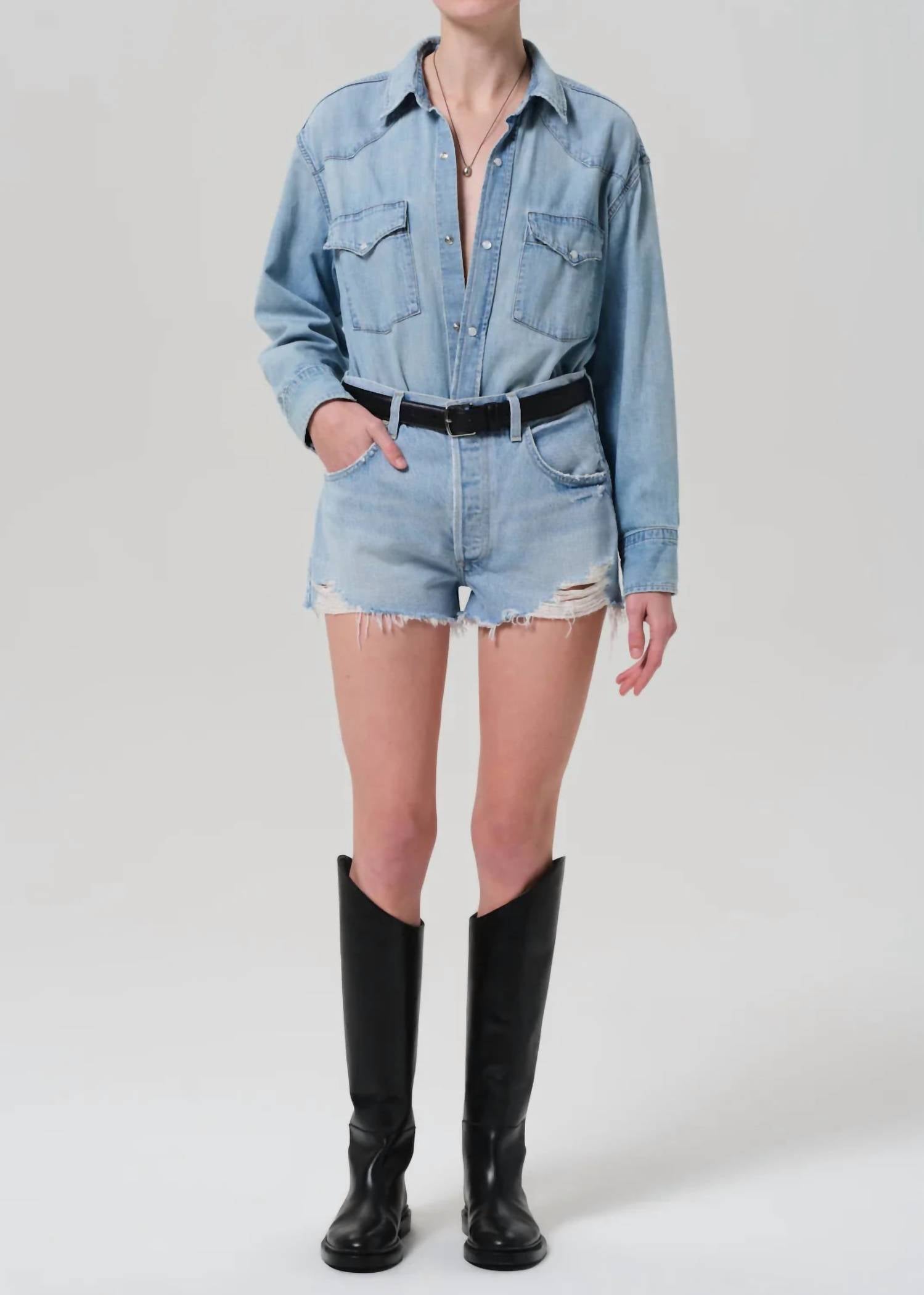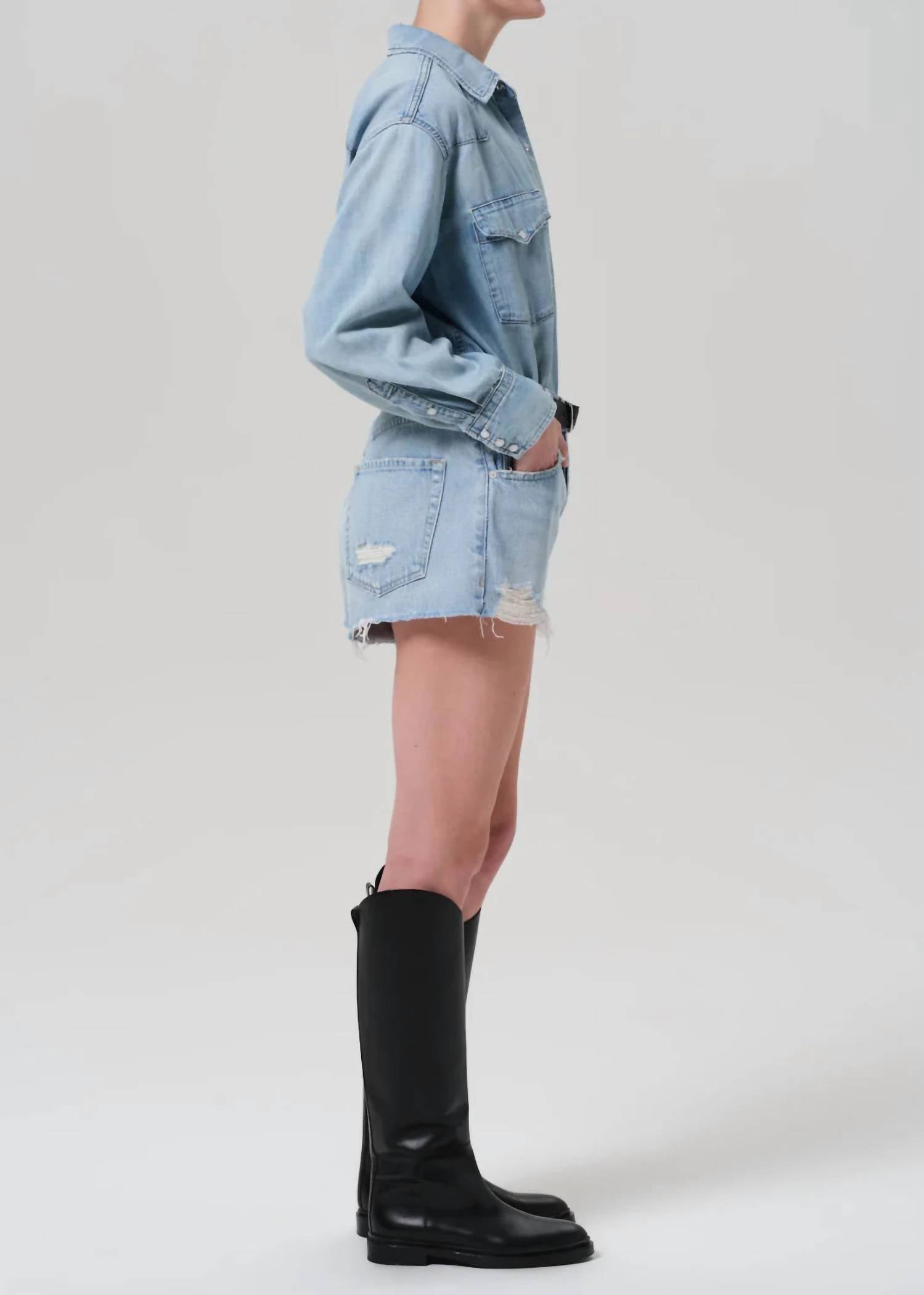Introducing the Loro Short by Citizens of Humanity, a must-have for your summer wardrobe. These women's jean shorts come in a light indigo shade called Cassidy with fading and whiskering details, crafted from solid rigid denim with renewable and recycled cotton for a soft, vintage feel. Featuring a high-rise style with a flattering short inseam and raw hem, they offer a structured, non-stretch fit that's ideal for warm weather days. Closure: Pull On. Care: Machine Wash. Perfect for spring occasions like music festivals, these shorts will quickly become your go-to for a Boho Chic look.