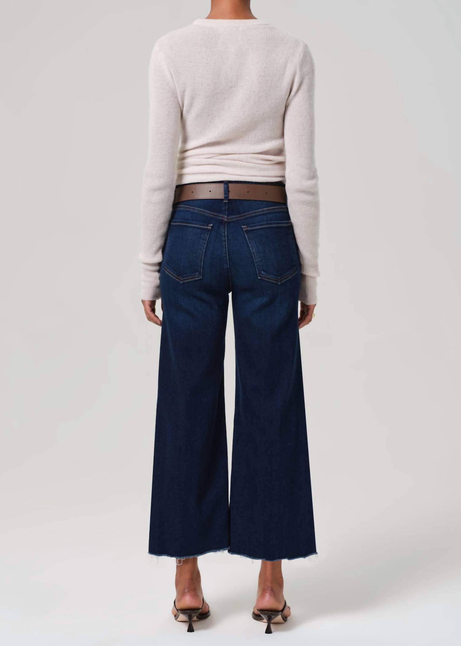 A flattering silhouette that's suprisingly versatile. Experience the effortless style of the Lyra Wide Leg Crop Raw Hem Jean by Citizens of Humanity in a trendy Lotus color. Crafted from a premium blend of 81% Cotton, 11% Lyocell, and 6% Polyester, these jeans boast a relaxed wide-leg fit with a mid-rise of 11.5 inches for a flattering silhouette. The dark wash denim is made in Turkey, featuring a 27-inch inseam and a spacious 24-inch leg opening, complete with a zip fly closure. Practical with pockets, these jeans are ideal for Spring holiday parties. Care instructions: Machine wash cold inside out with like colors, do not bleach, and tumble dry on low. The model is 5'10" and wearing a size 27.