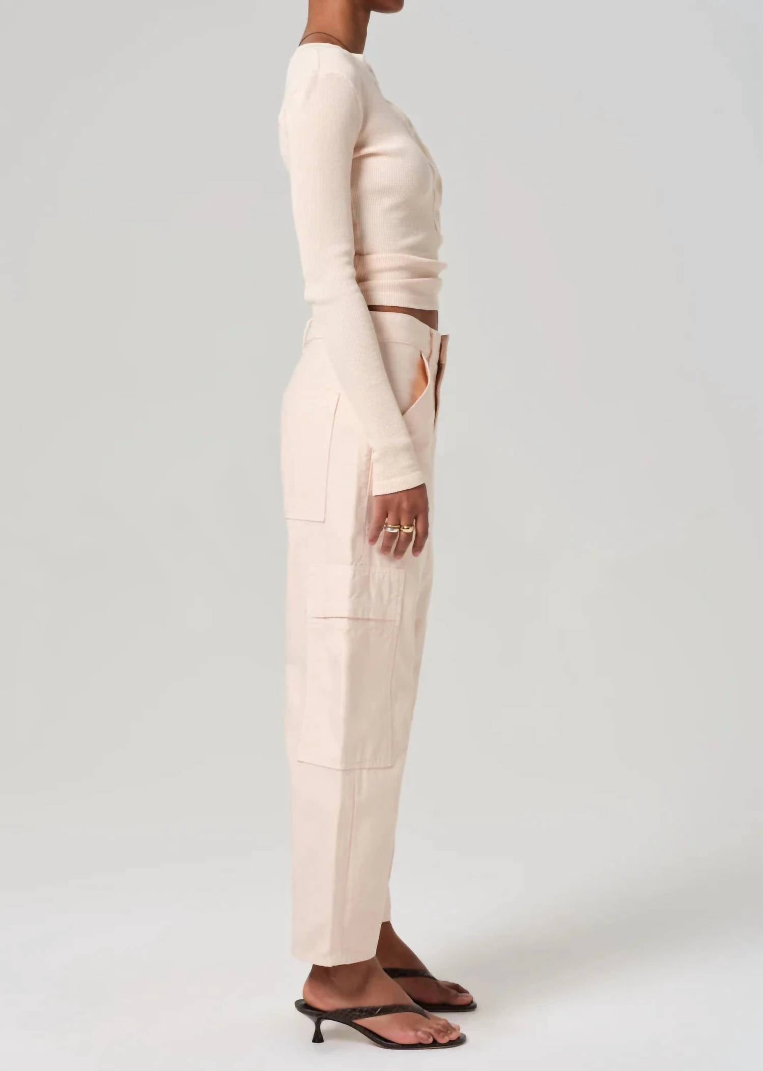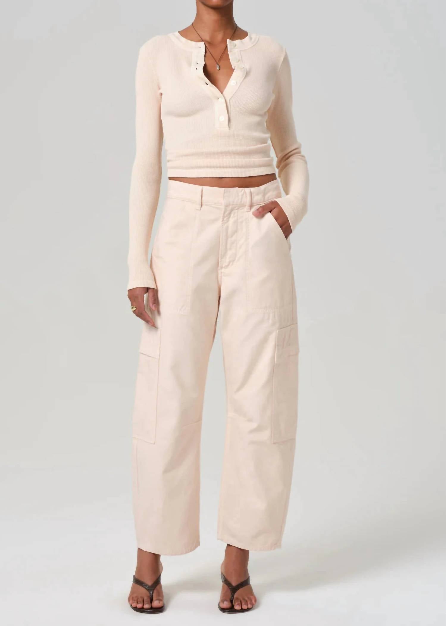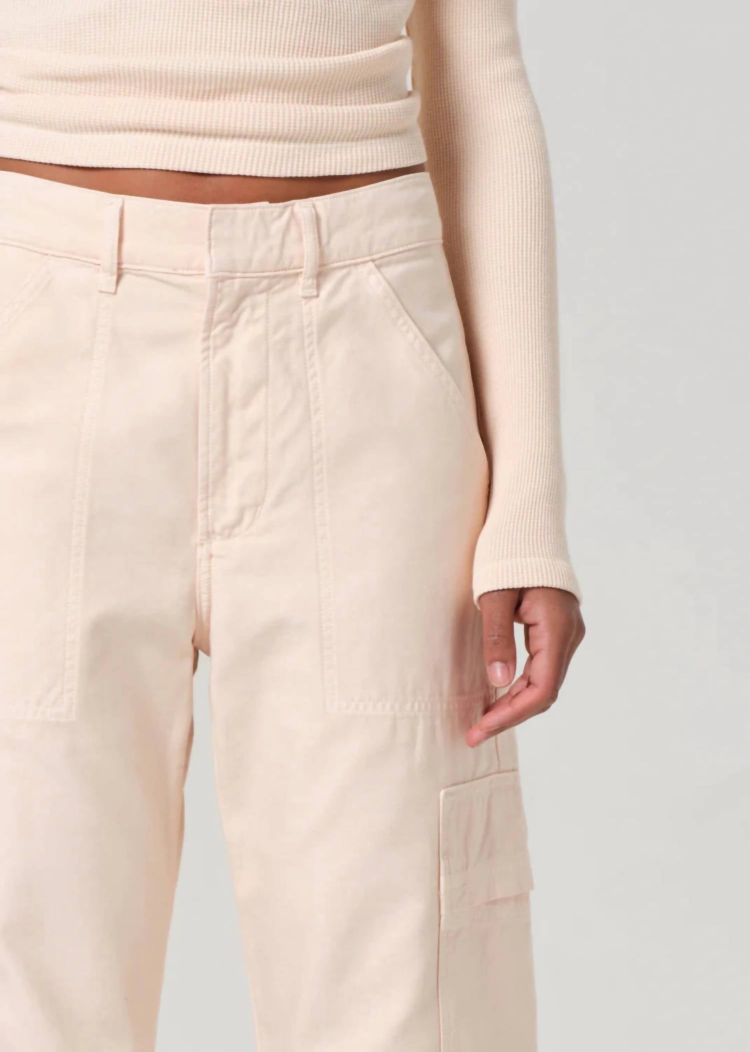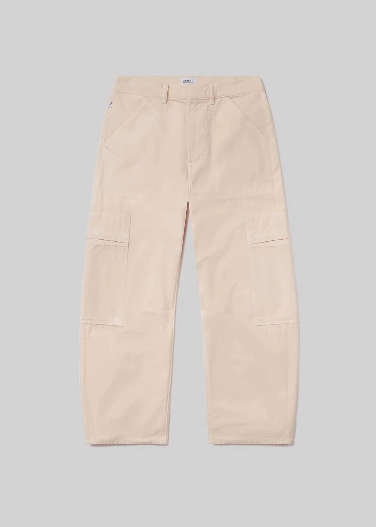 A perfectly tailored straight leg that you'll want in every color! Discover the Marcelle Low Slung Cargo Pants by Citizens of Humanity, your new go-to for effortless summer style. These light peach cargo pants feature a relaxed straight leg that tapers at the ankle, crafted from 100% regenerative cotton for a breathable, midweight feel. Made in Turkey with a zip fly closure, they sport an 11 3/4" rise, 27" inseam, and a 17 1/2" leg opening. Easy to care for, simply machine wash cold inside out, tumble dry low, and enjoy these versatile pants on vacation or any minimalist occasion. Model is 5'10" and wearing a size 27.