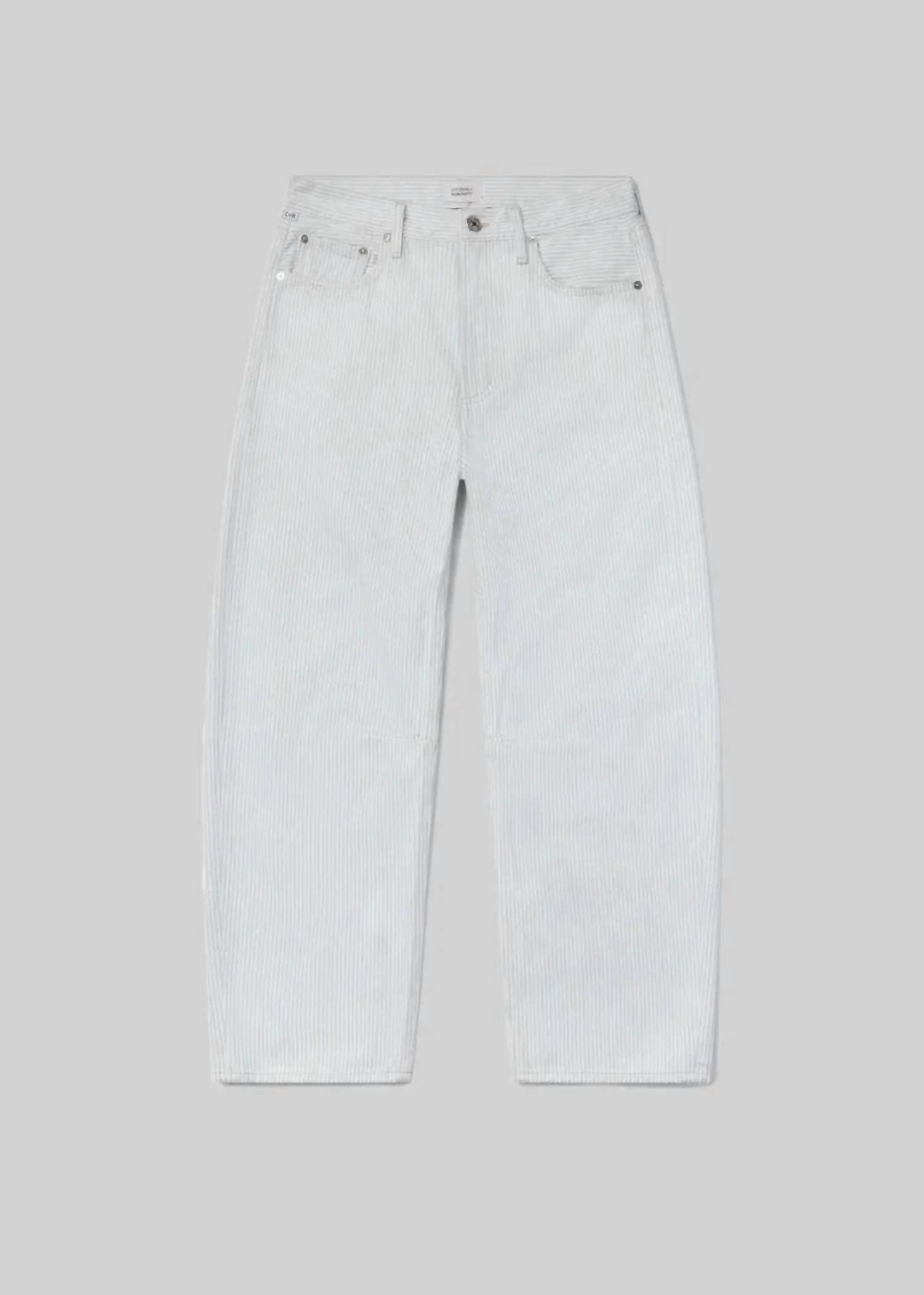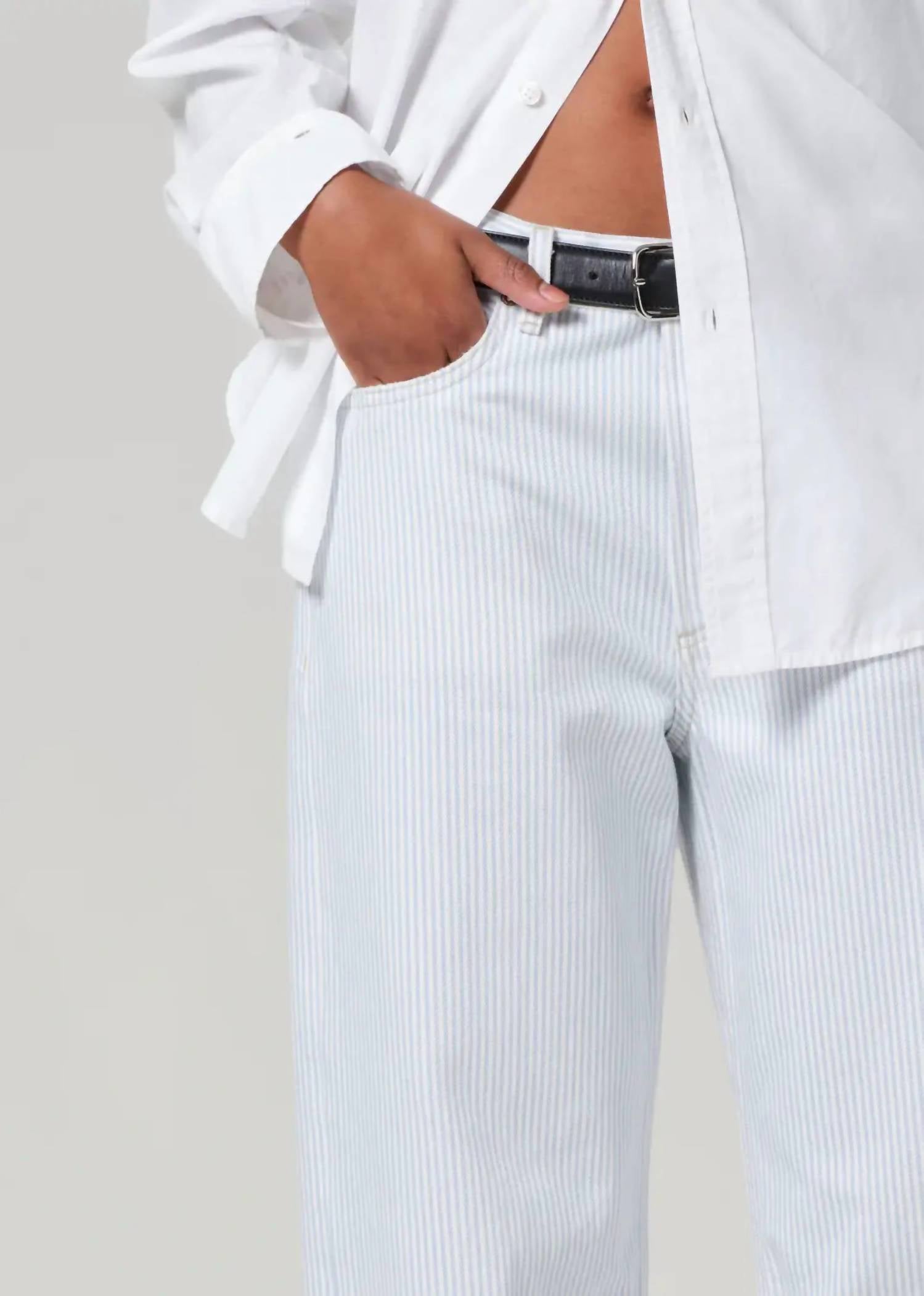This classic straight leg jean has a perfect fit and goes with just about everything. Elevate your spring wardrobe with the Miro Reworked Stripe Jean by Citizens of Humanity, featuring a subtle white and blue stripe pattern. Crafted from premium denim, these jeans present a slightly relaxed top block with a tapered barrel leg silhouette for a contemporary edge. The mid-rise fit is enhanced with a classic zip closure, offering both comfort and style for everyday wear.