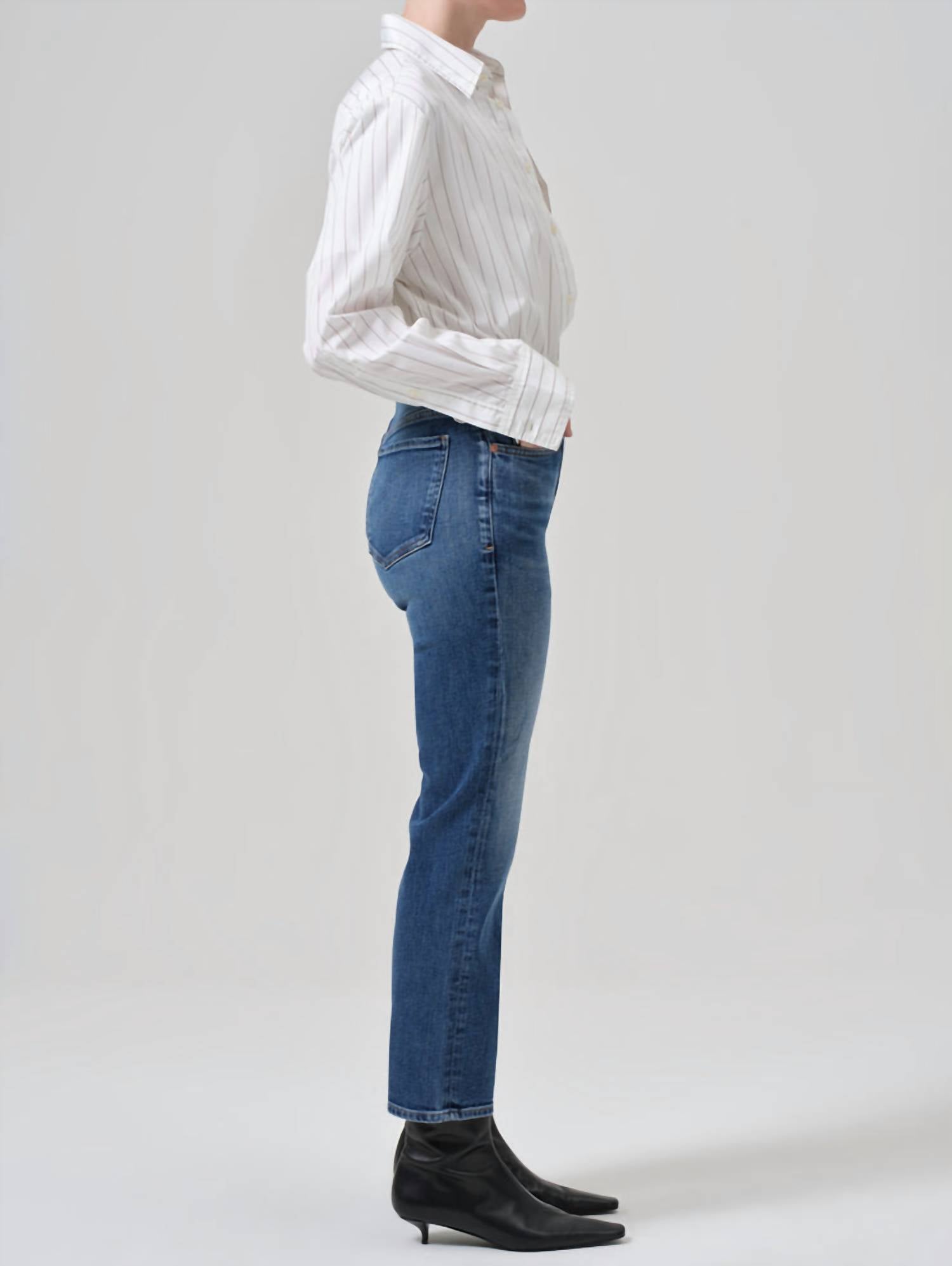 Comfortable and stylish, we love this cropped jean for all of the obvious reasons. Experience the effortless style of Citizens of Humanity with the Zurie Ankle Jean in a chic medium blue wash. These high-rise, straight-leg jeans feature a 5-pocket construction, subtle fading and whiskering, and a clean hem. Composed of a stretch denim blend with 98% cotton and 2% polyurethane, they are crafted with a classic zipper fly closure for ease. Measuring a front rise of 11 1/4 inches, a leg opening of 15 inches, and an inseam of 27 1/2 inches, these jeans are perfect for a spring holiday party. Imported for quality assurance, care for your jeans by machine washing them cold inside out with like colors and tumble drying low.