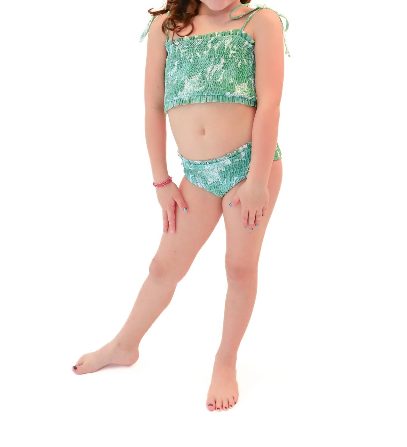 Get your girl summer-ready with the CITRINE Swim Kids Eva Bikini Set in vibrant Green Jungle. This patterned bikini is crafted from a soft and durable Nylon Blend, featuring slightly high-waisted bottoms for a comfortable fit and adjustable straps for the perfect wear. The smocked detailing adds texture and charm, making it ideal for a sunny beach day. Care for this delightful set by hand washing and laying it flat to dry.