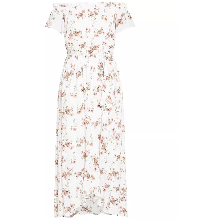 Approx. 51-9/10" long from center back neck to hem|Elasticated off-shoulder neckline; Fit & flare silhouette|Pullover styling|Short flutter sleeves|Elasticated waistline with matching self-tie belt; faux-wrap skirt; asymmetrical ruffled hem|Please note that this item has International Sizing. Please see US Sizing Conversions noted here that will appear on the merchandise tag when received: 14W= XS, 16W = S, 18W = M, 20W= L, 22W, = XL, 24W = XXL.