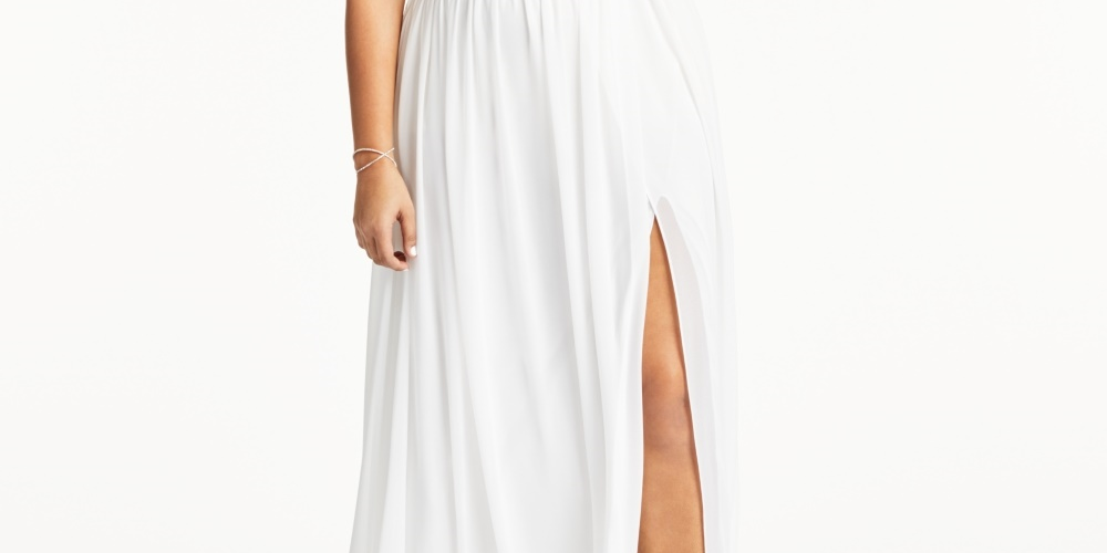 Approx. 62" long from center back neck to hem. Length varies 1/4" between sizes|Scoop neckline; Gown silhouette|Back zipper closure; keyhole with hook-and-eye closure|Glitter and lace popover top with mesh detail; wrap skirt with front slit|Lace top: nylon/polyester/spandex; skirt: nylon/spandex; lining: polyester