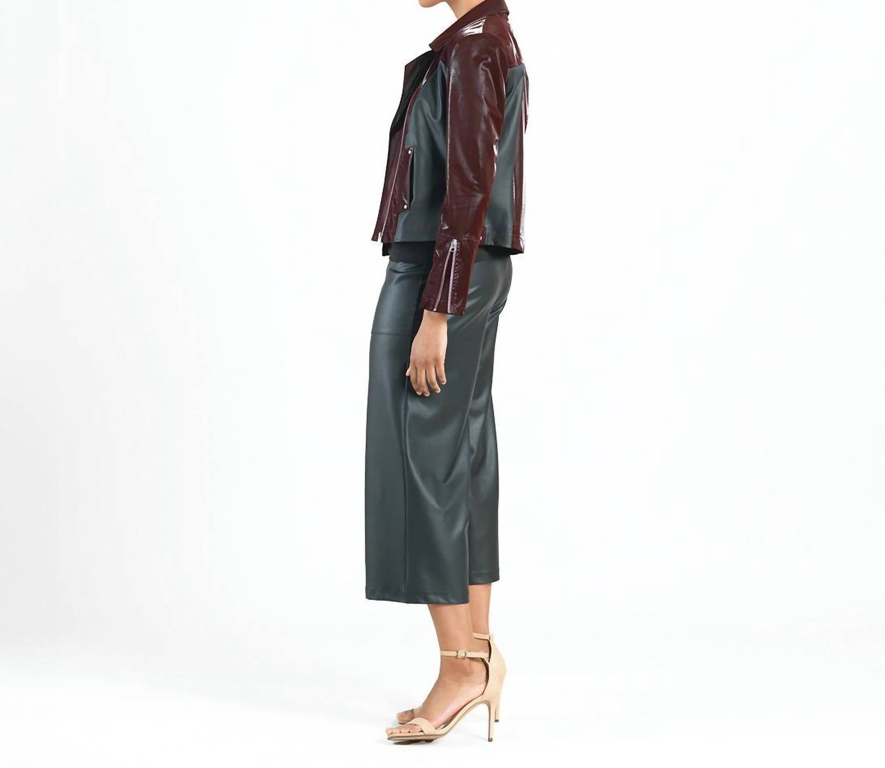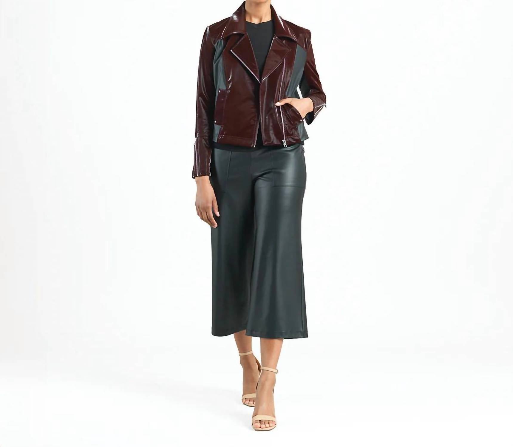 Everyone needs a leather jacket like this in their closet. This jacket is made from 100% polyurethane vinyl that resembles patent leather and features contrasting soft-sheen liquid leather panels. It has a high-shine finish, a satin-like lining, and a zip closure in silver. Water-resistant and easy to clean, it is designed for durability. The model is 5'9" and wearing an Extra Small (4/6). Color: Mulberry, SKU# JK225H.