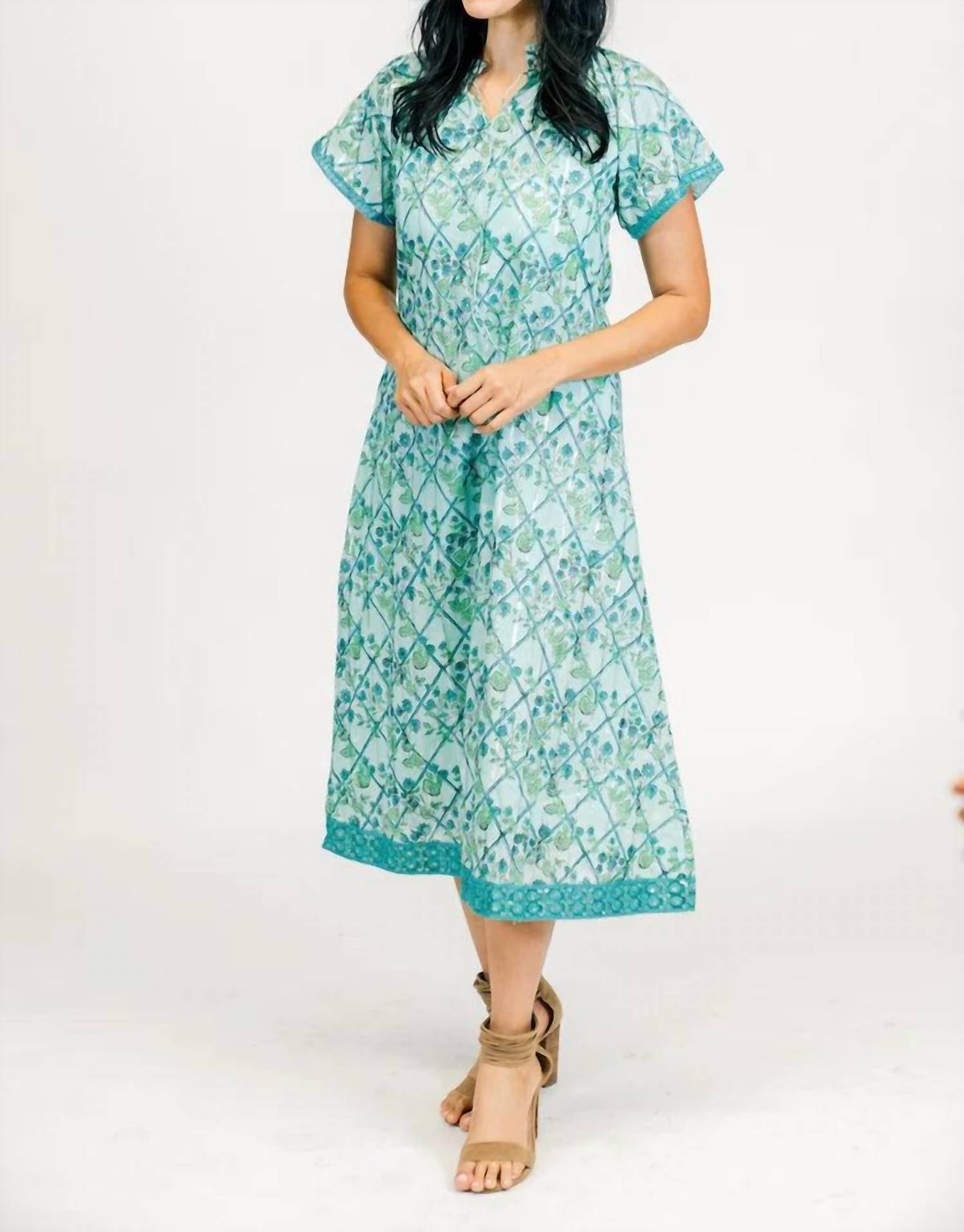 A midi dress so versatile, your options for wearing it are endless. Introducing the Blair Midi Dress by Clara the Label, a boho-chic piece perfect for summer vacations. In a stunning Blue Bell hue, this dress features short sleeves, a v-neckline with a tie closure, and an elegant embroidered trim. It is crafted from 100% Cotton Lurex and hand-blocked by artisans in Jaipur, India. For care, hand wash and line dry to ensure its longevity and beauty.