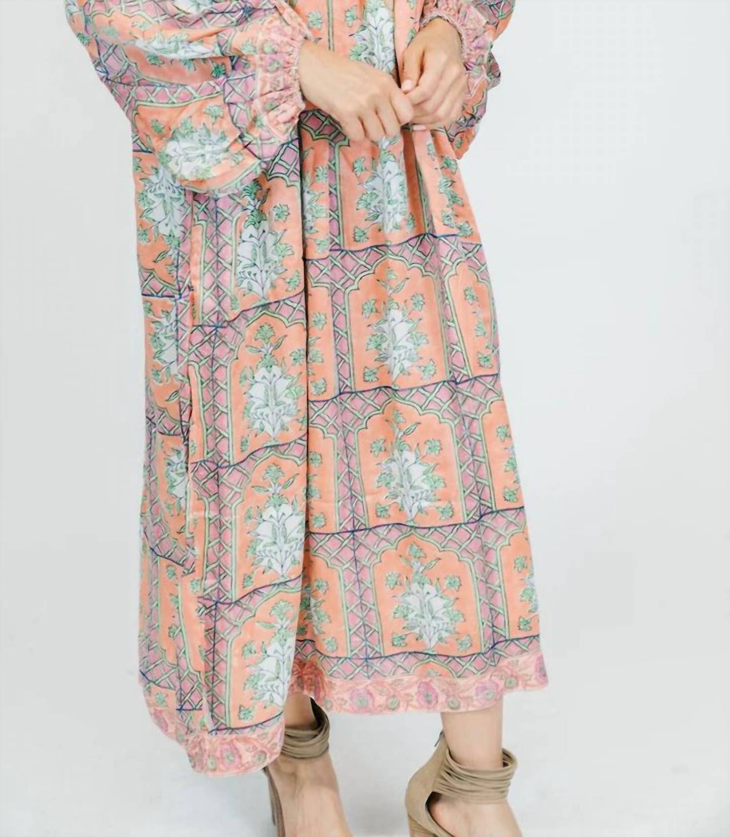 Introducing the Cassia Maxi Dress by Clara the Label, a stunning addition to your summer wardrobe in Peach Quartz. This boho-chic dress features long puff sleeves and a flattering A-line silhouette with a V-neckline, complemented by its hand-blocked pattern. Crafted with a 100% Viscose Silk Blend and lined for comfort, it offers a stylish flair with contrasting trim on the hem. Closure: Easy pull-on style. Care: Hand wash, line dry. Made by artisans in Jaipur, India.