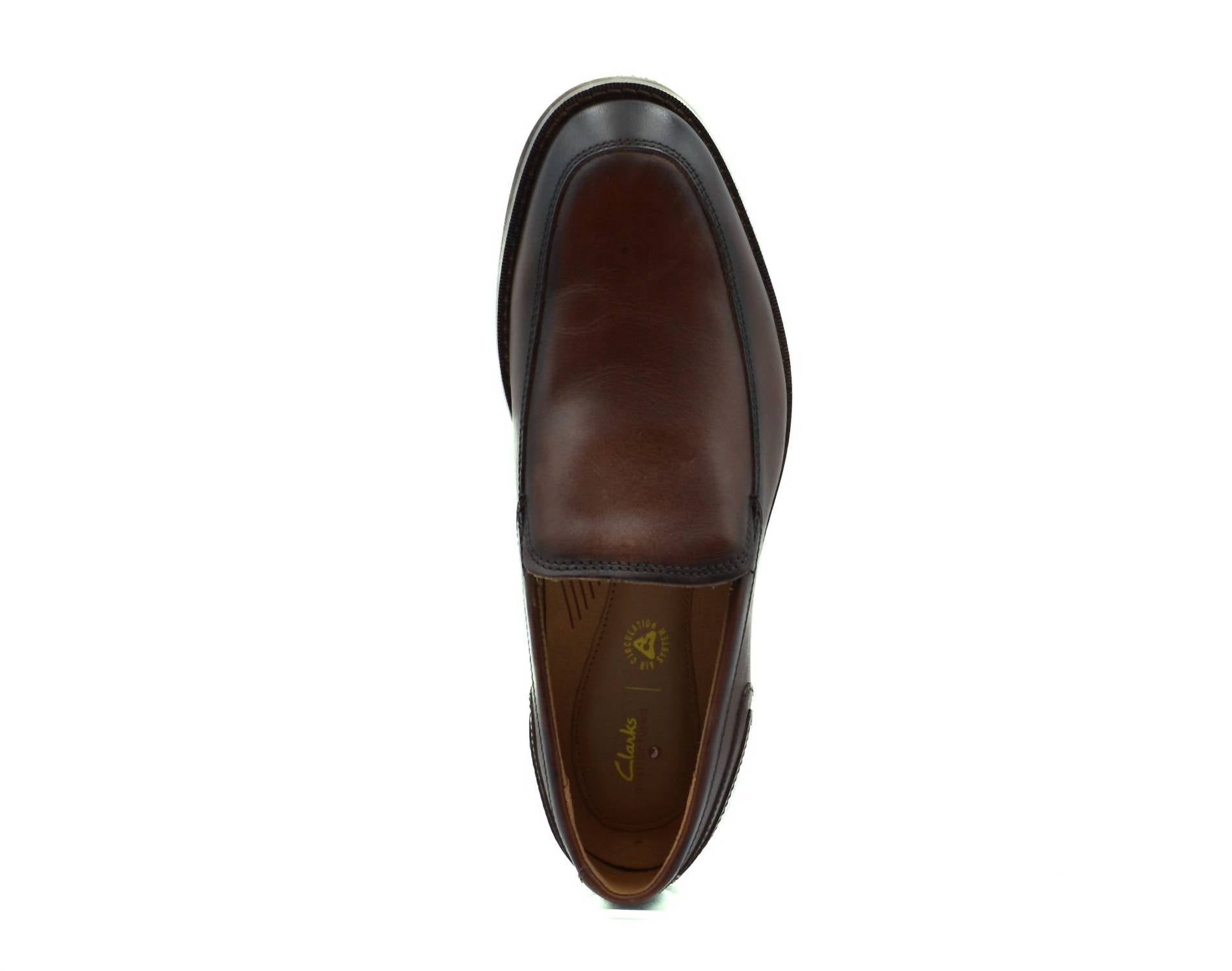Step into elegance with the Clarks Men's Un Hugh Step Shoes, a perfect blend of vintage and modern style. Crafted from high-quality leather, these loafers in a rich brown color offer an ideal choice for evening events. Featuring an almond toe shape and a sophisticated block heel, they provide both comfort and timeless appeal. Designed for the summer season, these slip-ons are a must-have for any fashion-conscious man.