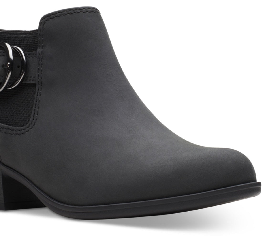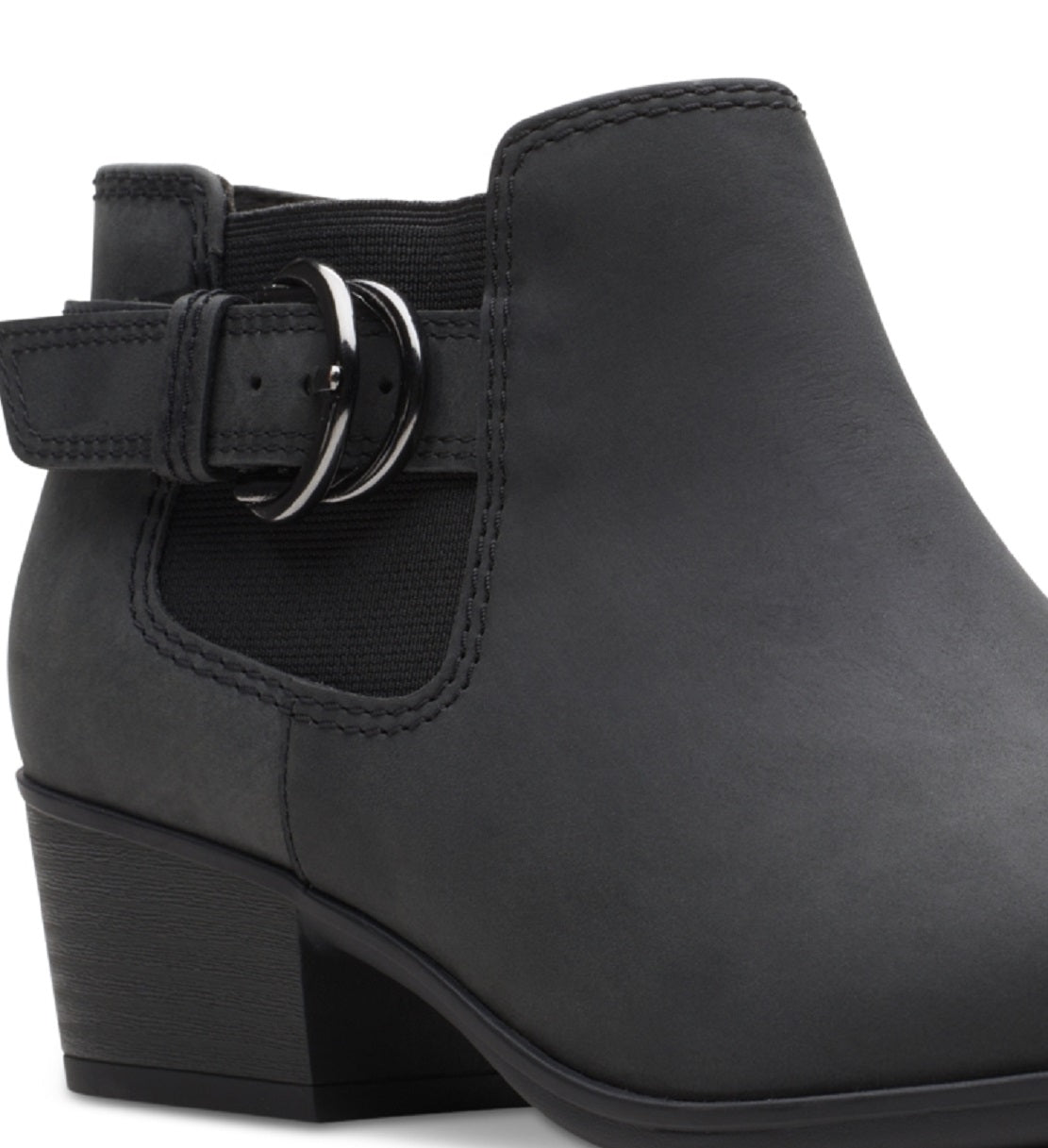 Accent your entire wardrobe with cool ring hardware and a block heel boost in the comfy Adreena Field booties by Clarks. The Ultimate Comfort footbed| easy-wear low heel and premium black leather upper make feet feel great all day long and offer endlessly versatile styling options.| 1-3/4 block heel| Round-toe booties with inner ankle zipper closure| Strap and ring hardware detailing| Ultimate Comfort footbed and cushioned insole for added comfort| Leather upper; fabric lining; manmade sole