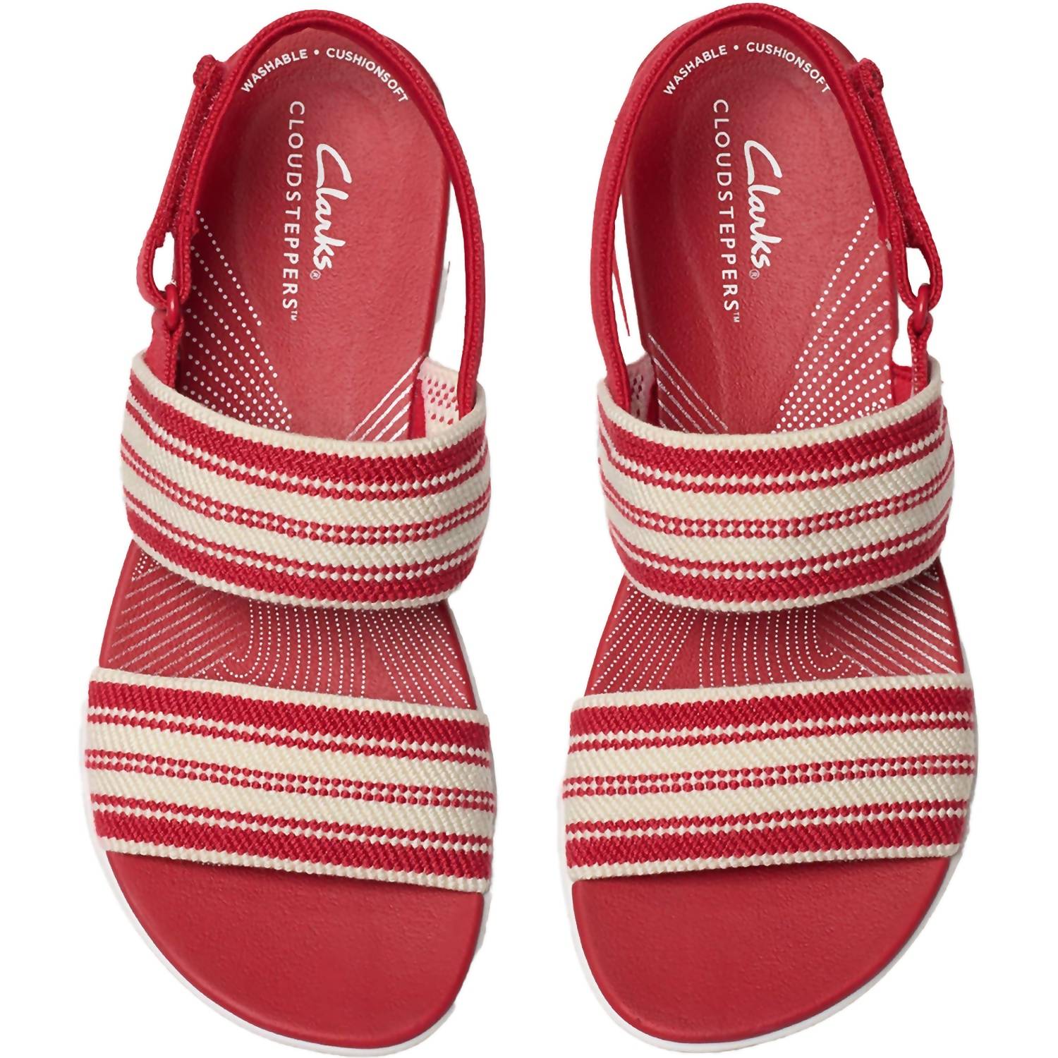 Classicly cute and all-day-wearable. We love this sandal. Introducing the Women's Clarks Cloudsteppers Arla Stroll Sandal, a chic addition to your spring wardrobe in a vibrant Cherry Combi hue. These sandals showcase a soft textile upper, synthetic material, and an open-toe design perfect for a day out in the sun. Designed with an adjustable closure for a secure, custom fit, they feature a Cushion Soft™ foam footbed and lightweight EVA midsole for unmatched comfort, boasting a 1.5-inch low wedge heel. Ideal for vacations and versatile occasions, these sandals are machine-washable, making them an easy-care companion for Mother's Day celebrations and beyond.