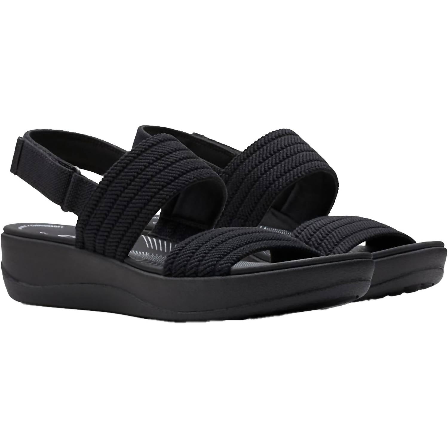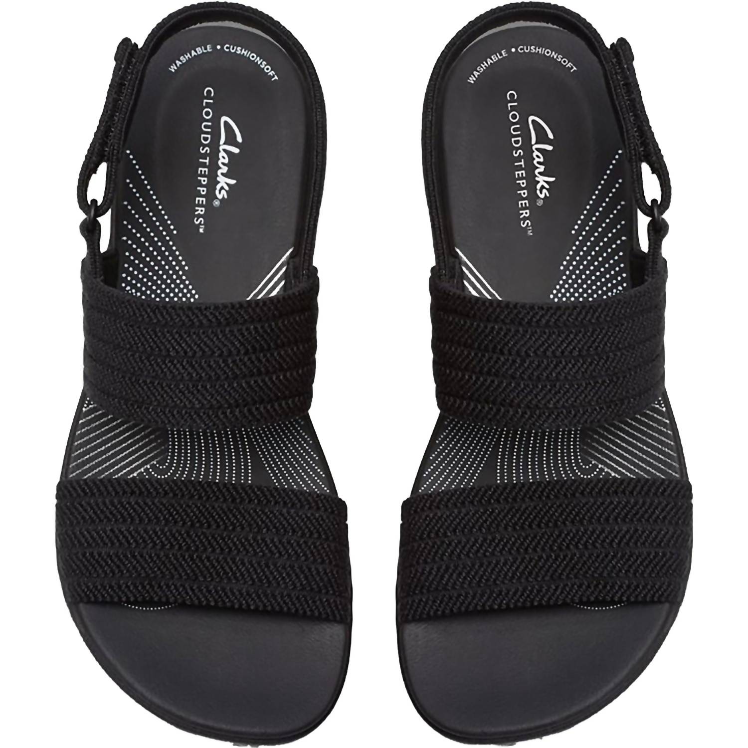 This sandal will take you from brunch to dinner and everything in between. Experience the ultimate in comfort and style with the Women's Clarks Cloud Steppers Arla Stroll Sandal, designed for a minimalist look in versatile black. These sandals feature a soft textile upper and an adjustable closure for a secure, custom fit. The lightweight EVA midsole and Cushion Soft™ foam footbed provide exceptional support and lasting comfort, while the 1.5-inch wedge heel adds a chic lift. Perfect for spring occasions, these sandals are machine-washable, ensuring effortless care for warm weather.
