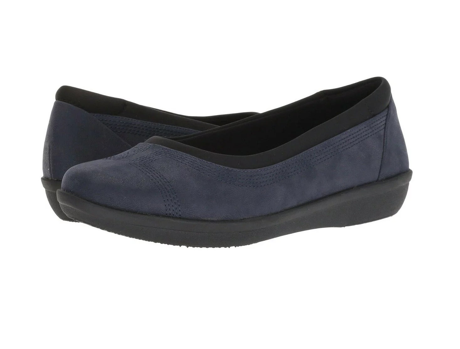 1 heel|Round-toe slip-on flats|Multiple lines of decorative stitching| black topline detail|Cloudsteppers lightweight comfort| Cushion Soft™ flexible sole technology| removable cushioned insole
