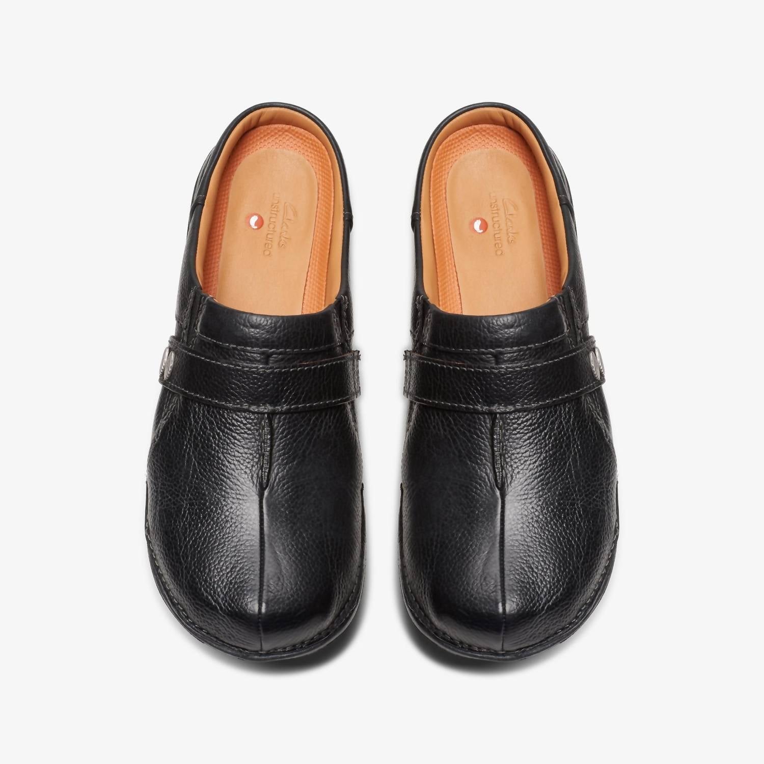 So comfy it's like you're walking on clouds. Experience the ultimate comfort with Clarks' Women's Un Loop Ease Slip-On Shoes in black, perfect for a minimalist spring look. Crafted from responsibly sourced chestnut leather, this leather mule features a round toe and low 1.18" flat heel, ideal for travel and Thanksgiving gatherings. The design includes a breathable leather lining, sock, and soft foam footbed paired with a lightweight EVA outsole that absorbs shock for all-day wear. Enjoy the next best thing to barefoot wear with Clarks' expertly crafted footwear.