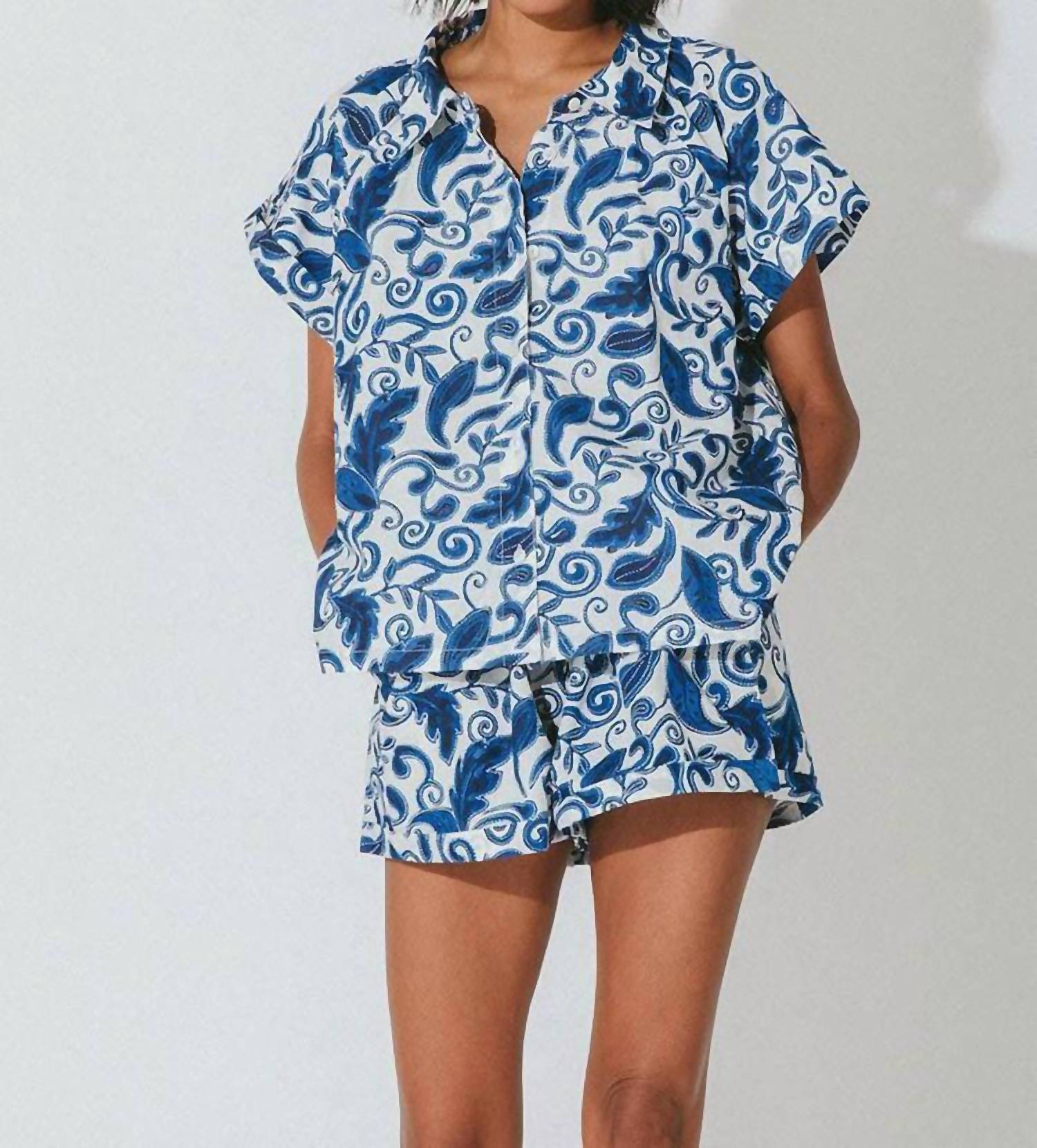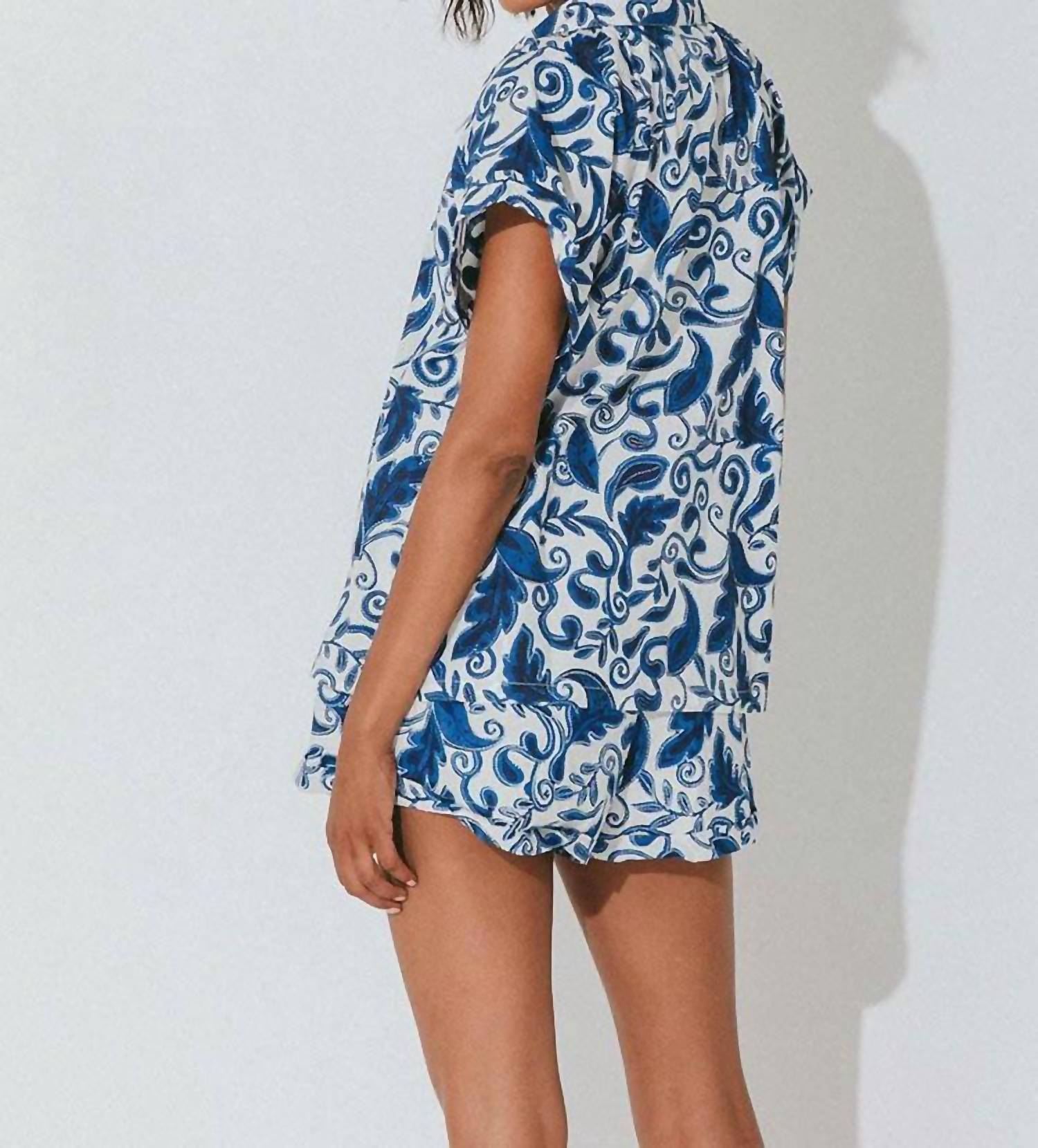 A versatile blouse that works from desk to dinner! Embrace effortless style with the Cleobella Acadia Blouse in vibrant Azulejo. Crafted from 100% GOTS certified organic cotton poplin, this short sleeve top features a collar neckline and a patterned design that is both fun and functional. Closure: Button closure. Care instructions: Hand wash recommended, lay flat to dry.