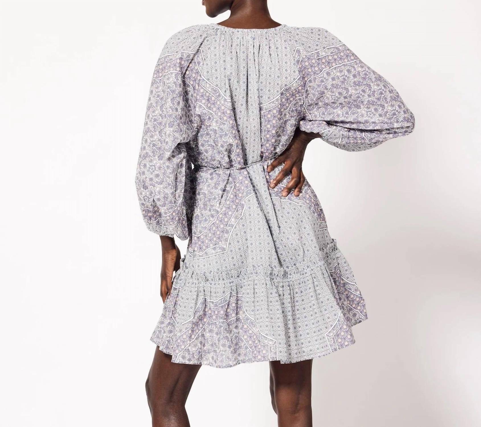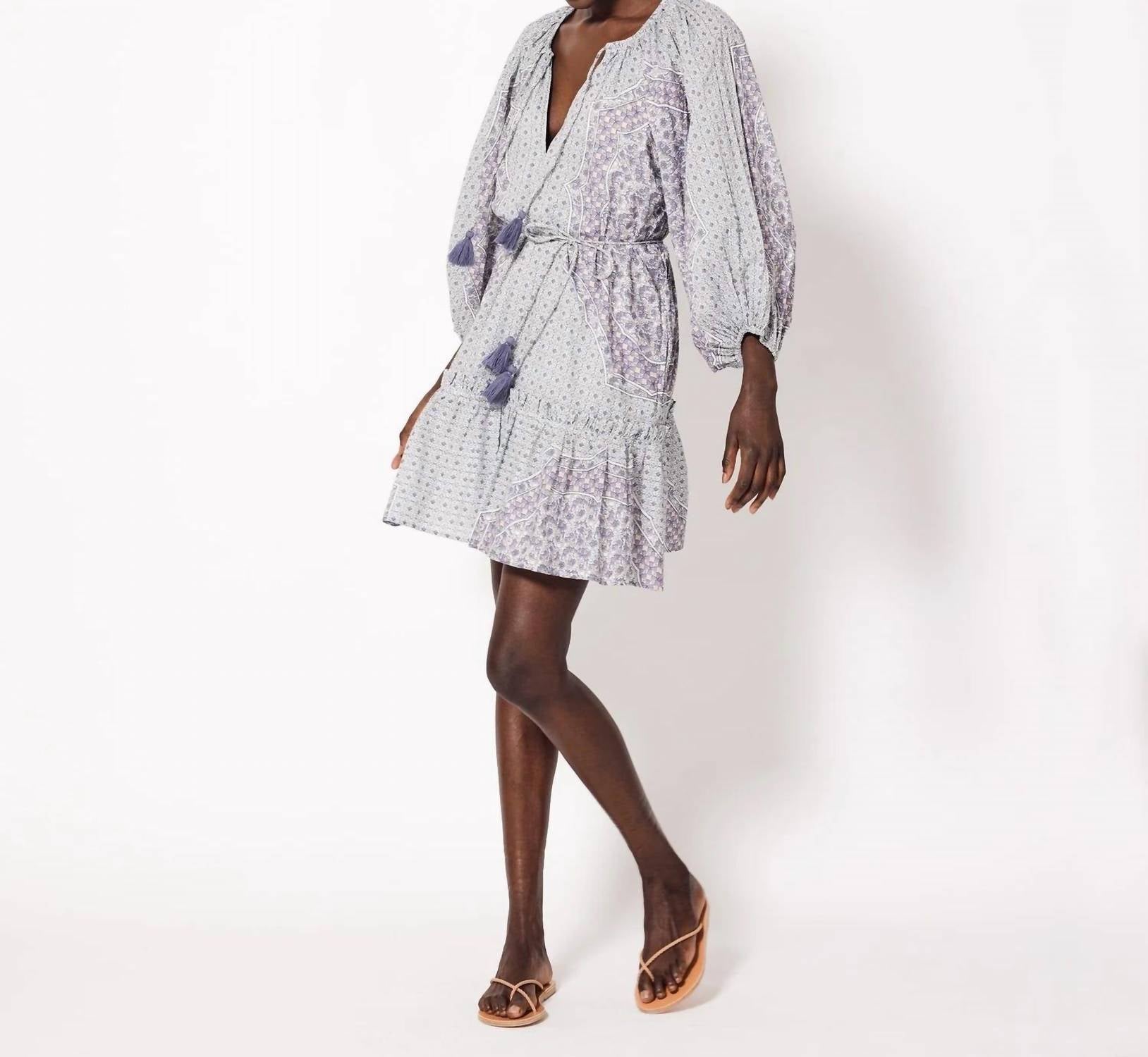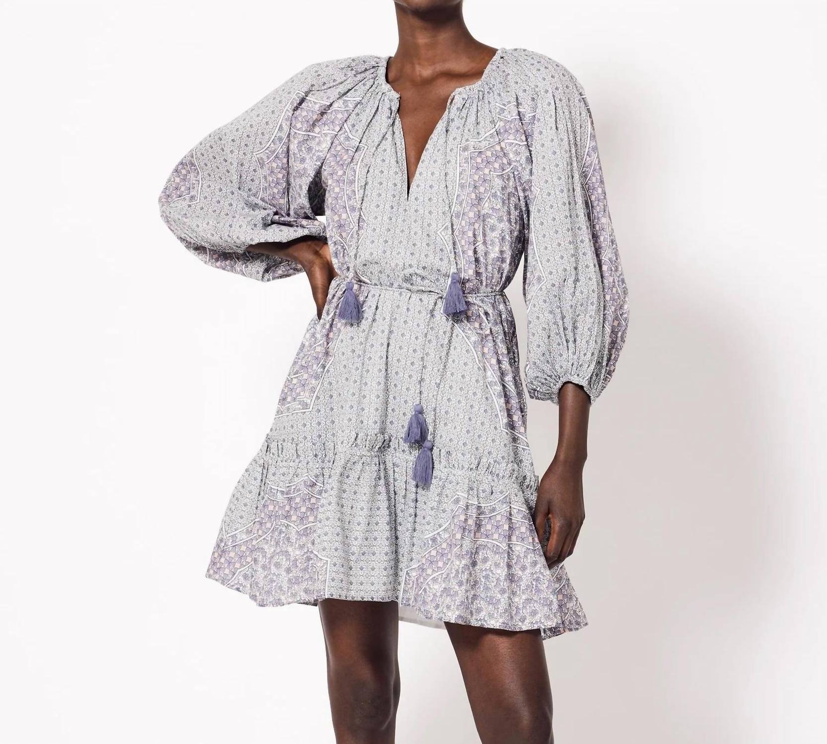 A short and breezy dress for those warmer days. Introducing the Benita Mini Dress by Cleobella, an ethically handmade masterpiece in a charming Paloma color. Crafted from 100% GOTS certified organic cotton voile, this A-line dress features a graphic print placed at the body and three-quarter sleeves. Made in India, it showcases a V-neckline, elasticized sleeve openings, and pockets for added convenience. Closure: Tunneled rouleaux tie at neckline with tassels. Care: Hand wash cold, lay flat to dry.