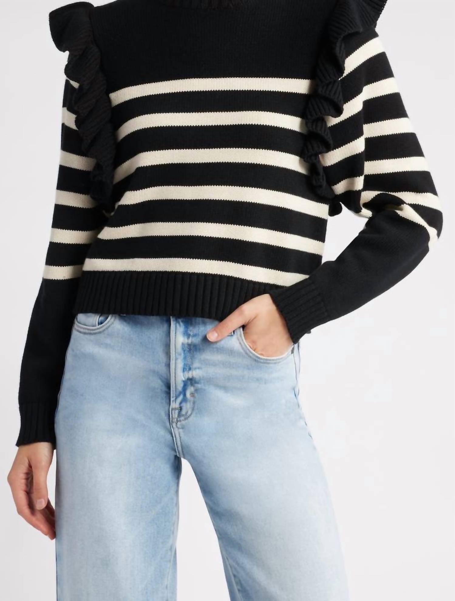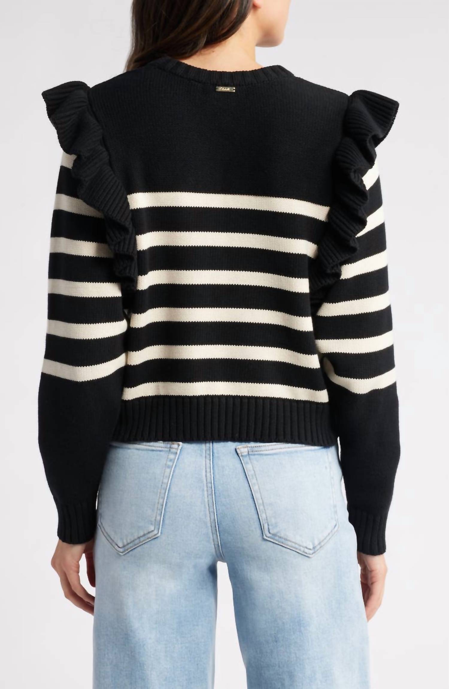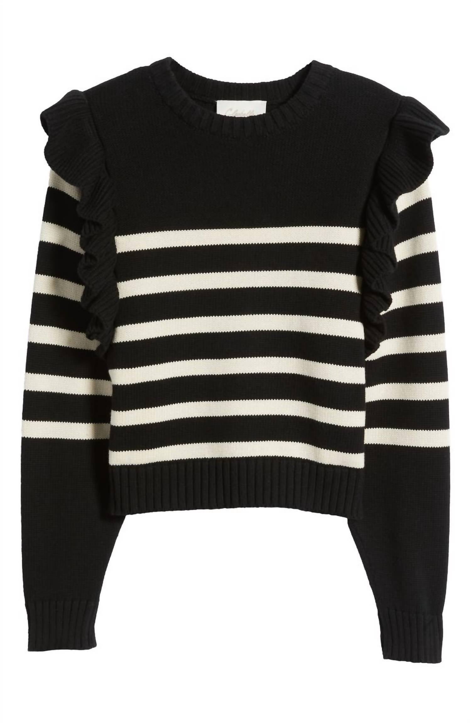 Experience the perfect blend of comfort and style with this trendy crew neck sweater, designed to effortlessly elevate your wardrobe. Pair it with your favorite denim and loafers for the perfect look. Introducing the Blair Sweater by Cleobella, a delightful addition to your wardrobe with fanciful shoulder frills. Crafted from 100% organic cotton, this lively striped sweater features long sleeves and measures 19 inches in length for a size Medium. Styled in a chic Black/Ivory stripe pattern, it offers a classic crewneck design and a convenient pull-on closure. For optimal care, this sweater should be dry cleaned.