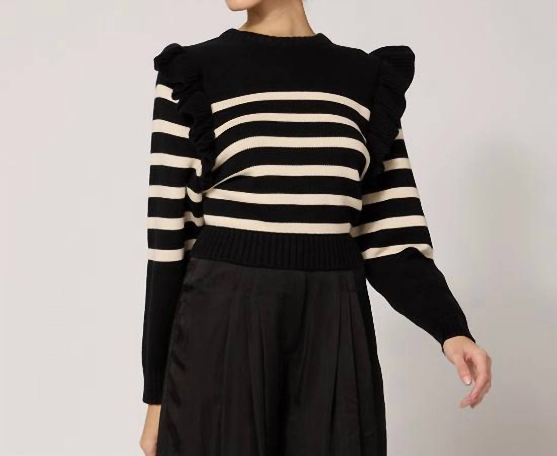 Elevate your casual ensemble with the Blair Sweater by Cleobella, showcasing playful black and ivory stripes. This women's top comes with long sleeves and a stylish crew neck, providing comfort with its cotton construction. The length is perfectly cropped at 18.5 inches for a modern twist. It's a pull-on design, best maintained by hand washing.