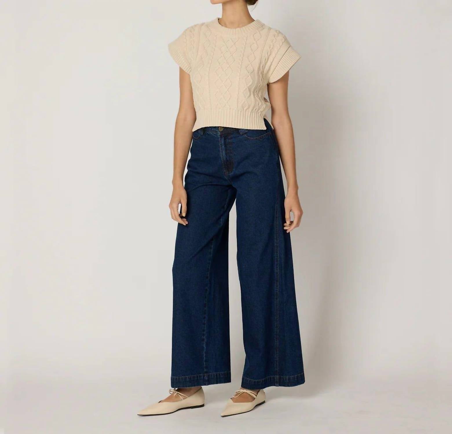 Meet the Gigi Sweater Vest by Cleobella, a chic addition to your wardrobe crafted from 100% organic cotton yarn. This cream-colored, cap-sleeve vest features an engineered cable knit design with stylish side seam slits and drop shoulders. Designed in India, it is 21.25 inches in length and sports a classic crewneck with a convenient pull-on closure. For care, machine wash and line dry, ensuring it remains a favorite for workwear or special occasions like Valentine's Day.
