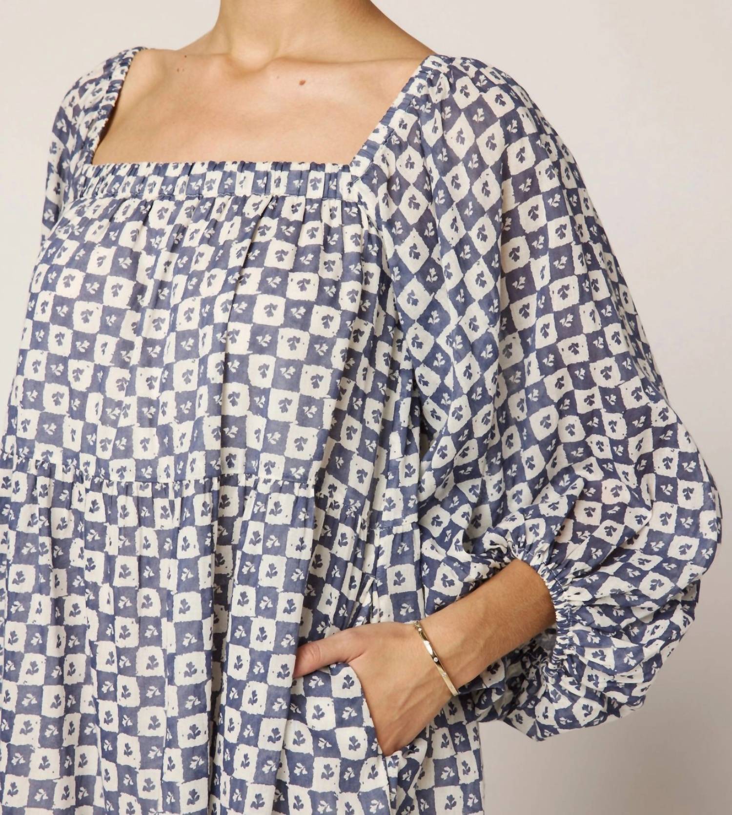 The kind of easy and flattering dress you'll be reaching for all season long. Embrace effortless style with the Hattie Mini Dress by Cleobella, crafted from 100% GOTS certified organic cotton mulmul. This Piazze Check patterned dress boasts a shirt silhouette with a square neckline and three-quarter sleeves, ideal for a boho chic look. A pull-on closure ensures ease of wear, complemented by the oversized, flowy design. Care for this vacation-ready staple by hand washing and laying flat to dry, while enjoying convenient pockets for practicality. Garment length: 34.5 inches.