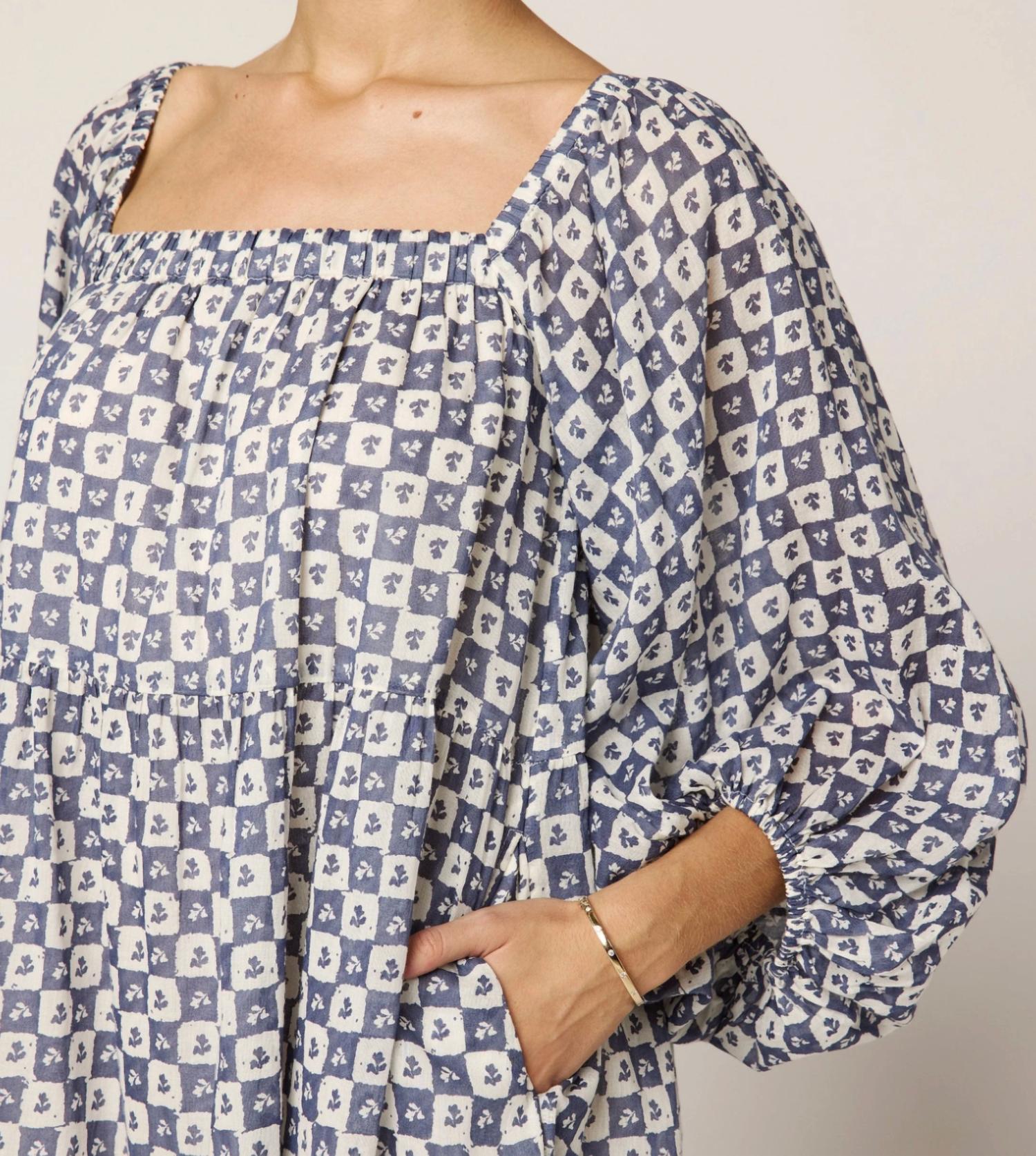 The perfect mini dress for those warmer months. Meet the Hattie Piazze Check Mini Dress by Cleobella, a minimalist and stylish choice for your conscious wardrobe. This dress showcases three-quarter sleeves with elasticized openings and a flowy, oversized silhouette crafted from 100% GOTS certified organic cotton mulmul. Ethically handmade in India with a pull-on closure, it includes practical pockets and is lined for added comfort. Care instructions recommend a hand cold wash and laying flat to dry. Model Ana is 5'9.5" and wears a size small.