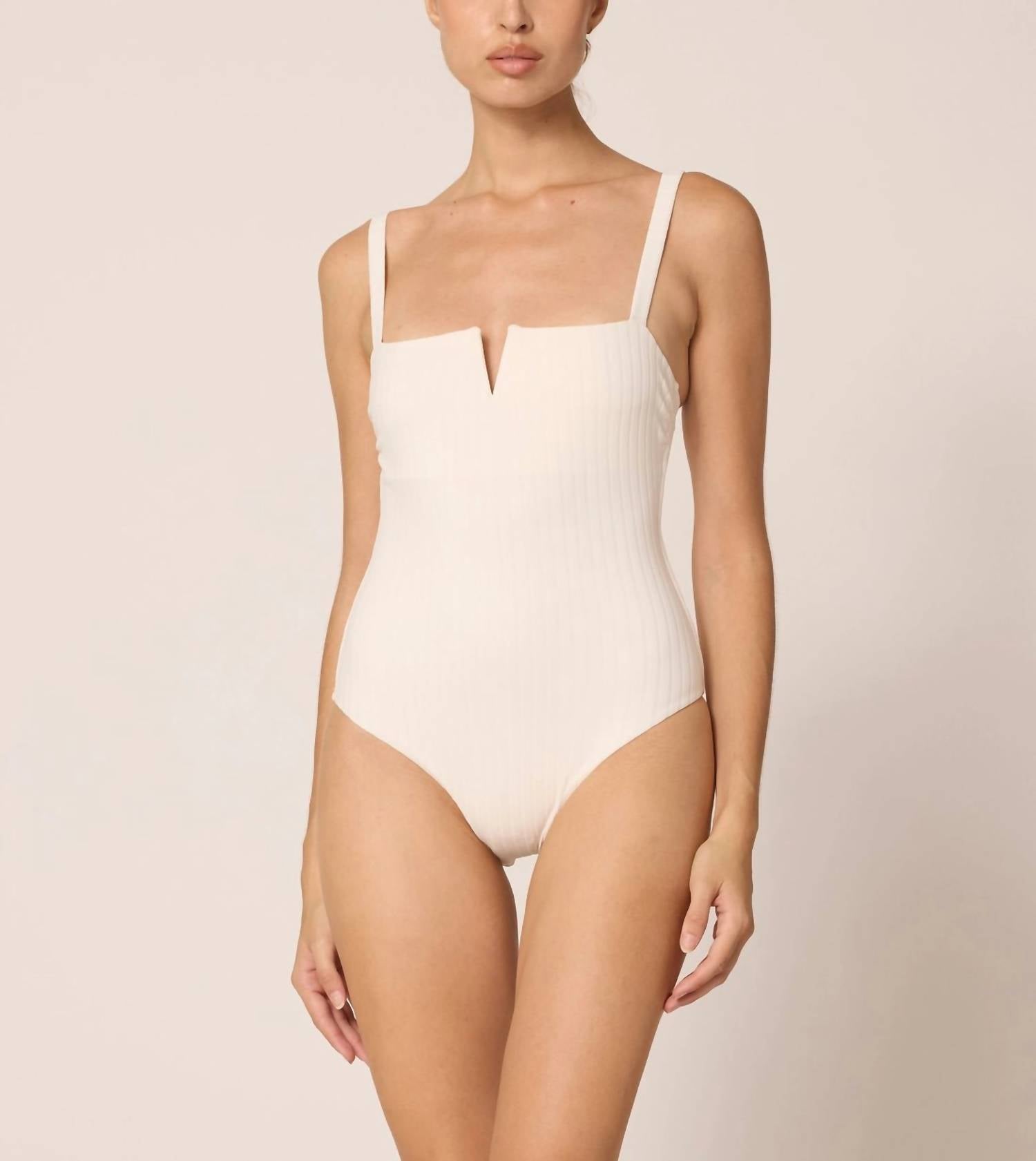 This one piece fits like a glove and covers all the right areas. Introducing the Monica One Piece Swimsuit by Cleobella, a stylish and sustainable swimwear choice for your summer beach days. Sleeveless with a textured finish, it is crafted from 80% recycled nylon and 20% elastane, ethically made in Sri Lanka. This swimsuit features a bustier bodice with a V wire neckline and adjustable straps for a flattering fit. Care instructions include hand washing cold and laying flat to dry; Ana, standing at 5'9.5", wears a size S.