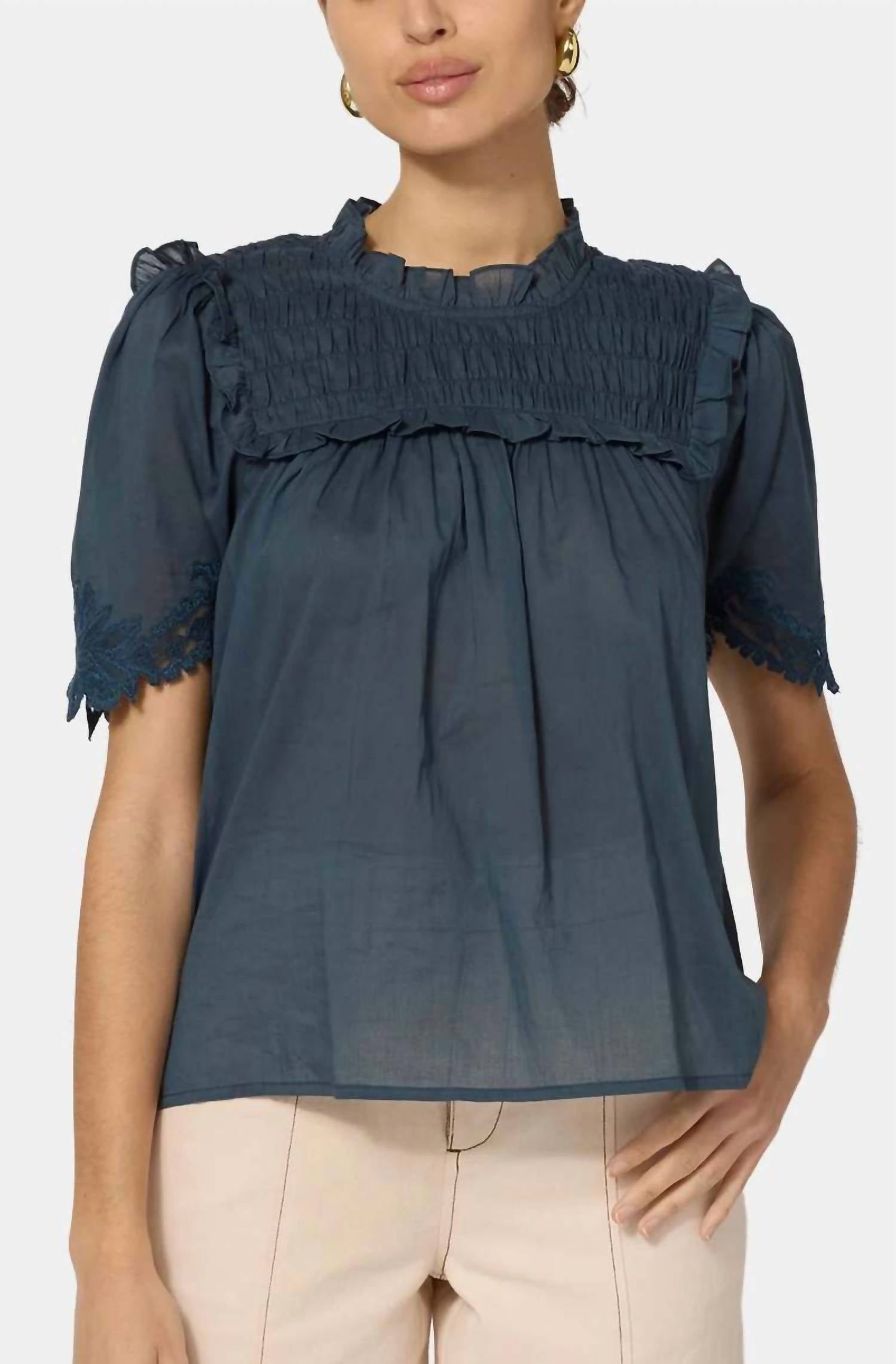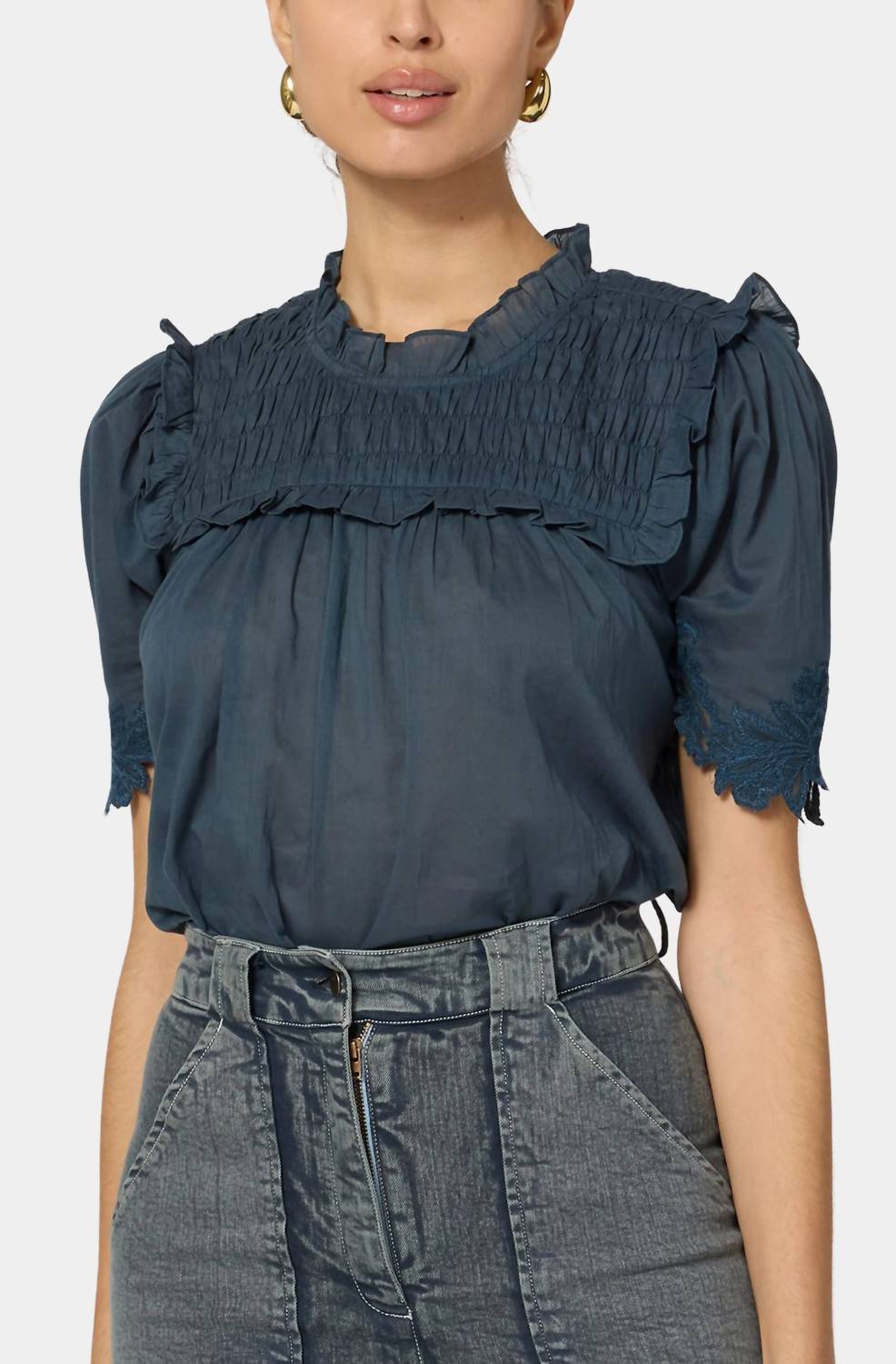 A versatile blouse that works from desk to dinner! Discover the Nicky Blouse by Cleobella, a chic addition to any wardrobe with its solid blue design and short sleeves. This women's blouse features a classic crewneck, perfect for creating a polished appearance for church or any springtime occasion. While specific wash and dry instructions are not provided, the versatile and feminine ruffle accents make it suitable for both office and weekend wear. Made without pockets, this blouse offers a streamlined silhouette for a sophisticated look.
