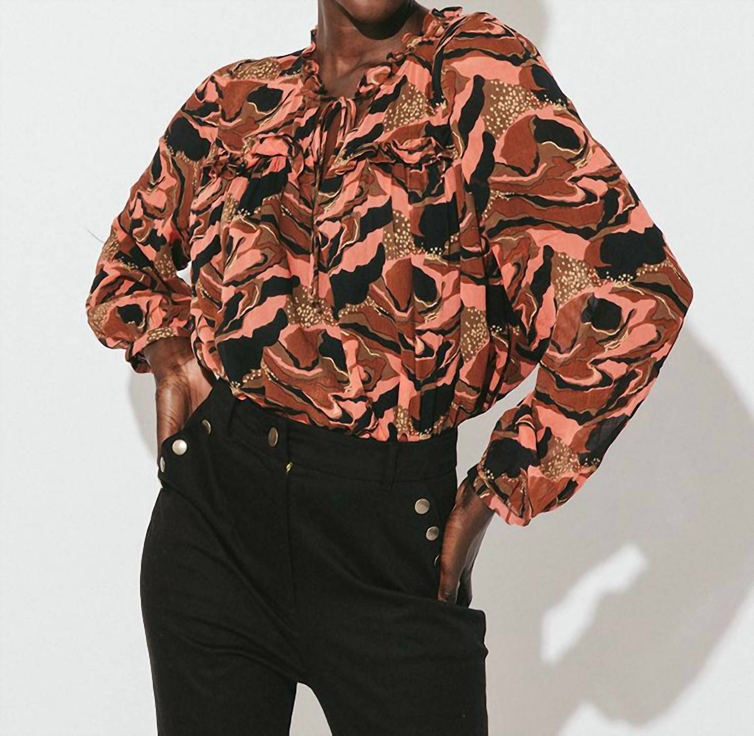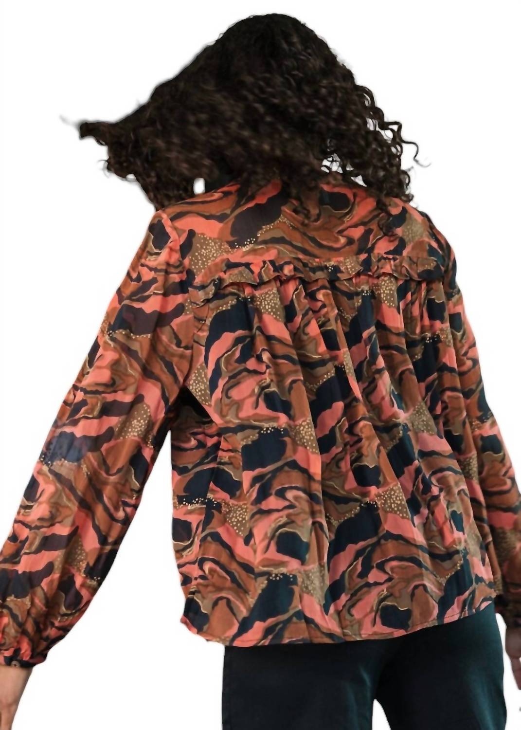A versatile blouse that works from desk to dinner! Introduce a bit of folk-inspired elegance to your wardrobe with the Octavia Blouse by Cleobella, presented in a Canyon hue. This blouse showcases long sleeves and a beautifully placed yoke, complemented by charming ruffles and a subtle, patterned design. Made from 100% Viscose, it features a delicate tie closure at the V-neck. Crafted for spring occasions, it requires hand washing and line drying for long-lasting wear.