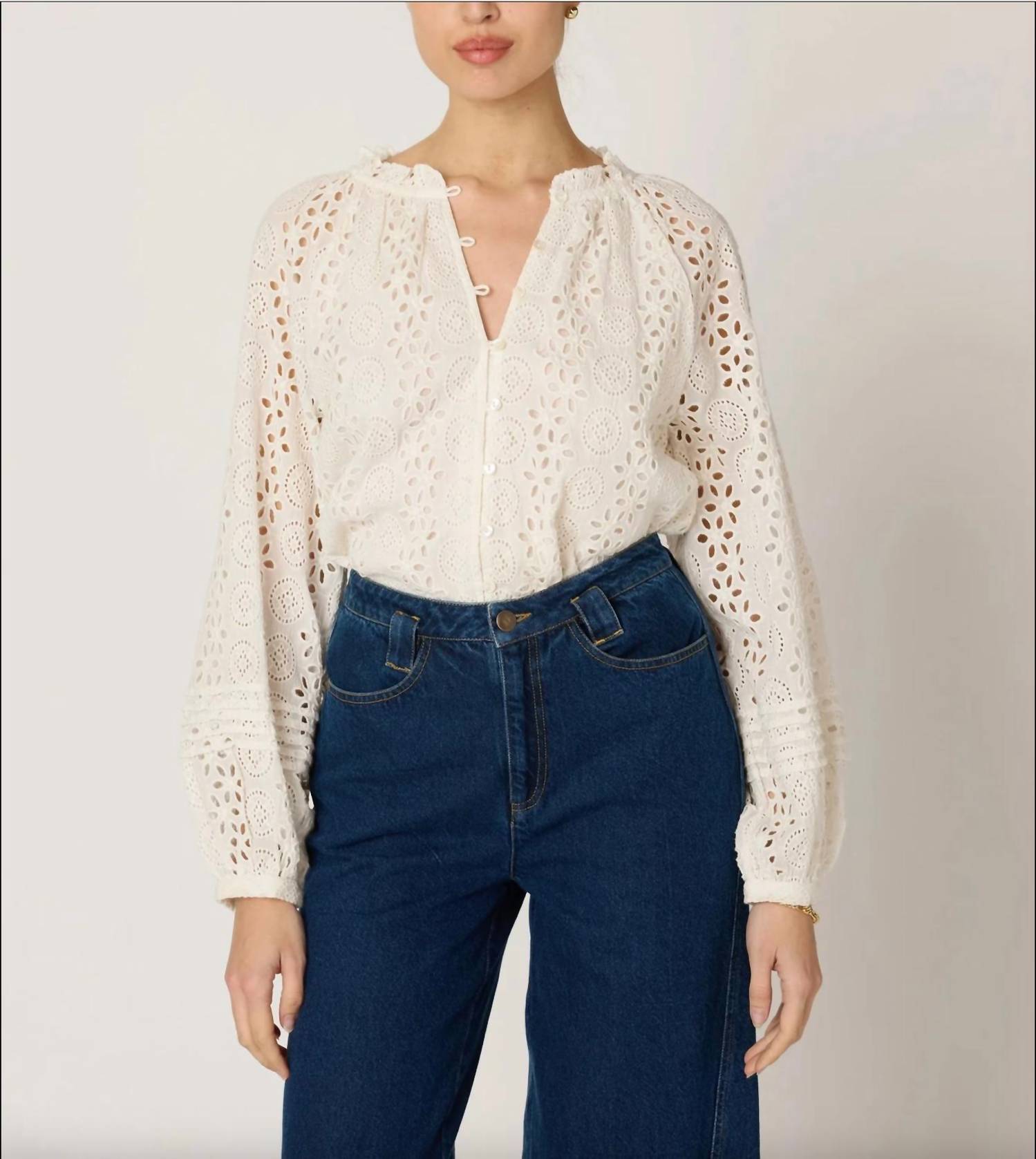 A versatile blouse that works from desk to dinner! Unleash your inner adventurer with the Women's Alicia Blouse by Cleobella, bringing a touch of bold elegance to any Spring wardrobe. Crafted from textured ivory cotton, this long sleeve blouse features a stunning eyelet trim that perfectly complements its mockneck design. The button closure ensures an easy fit, while its Boho Chic aesthetic makes it a standout choice for a dinner party. Care is simple—hand wash and lay flat to dry.