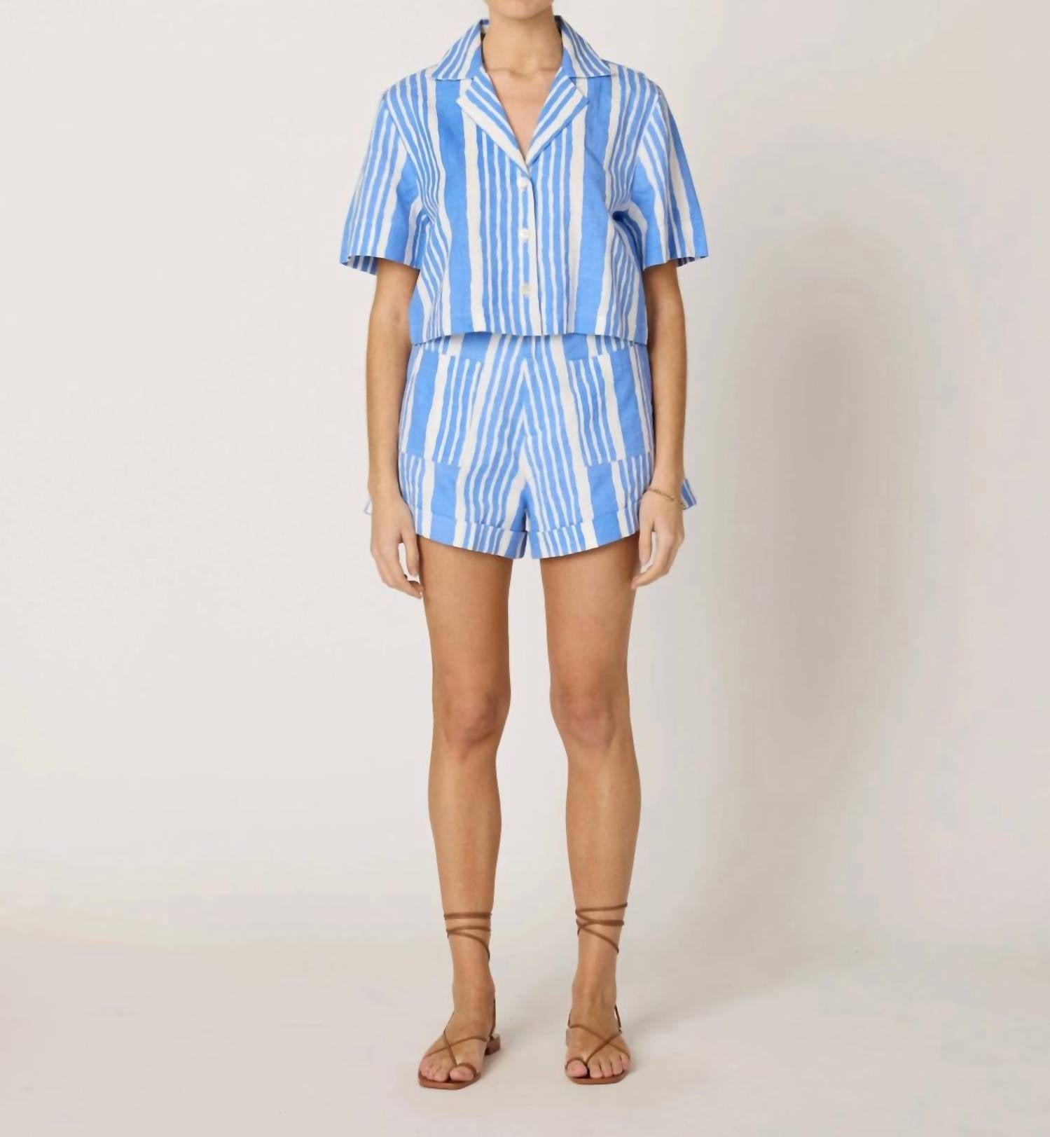 A timeless blouse that will never go out of style. Discover the Cleobella Women's Mizuki Blouse, a chic addition to your wardrobe crafted for comfort and style. Ethically handmade from dreamy cotton linen in India, this blue short-sleeve blouse features a stylish stripe pattern and a classic collar neckline. With a button closure, it's designed for a bra-friendly, effortless fit perfect for vacation streetwear. Care is uncomplicated with machine wash instructions, making it an easy and elegant choice for your spring ensemble.