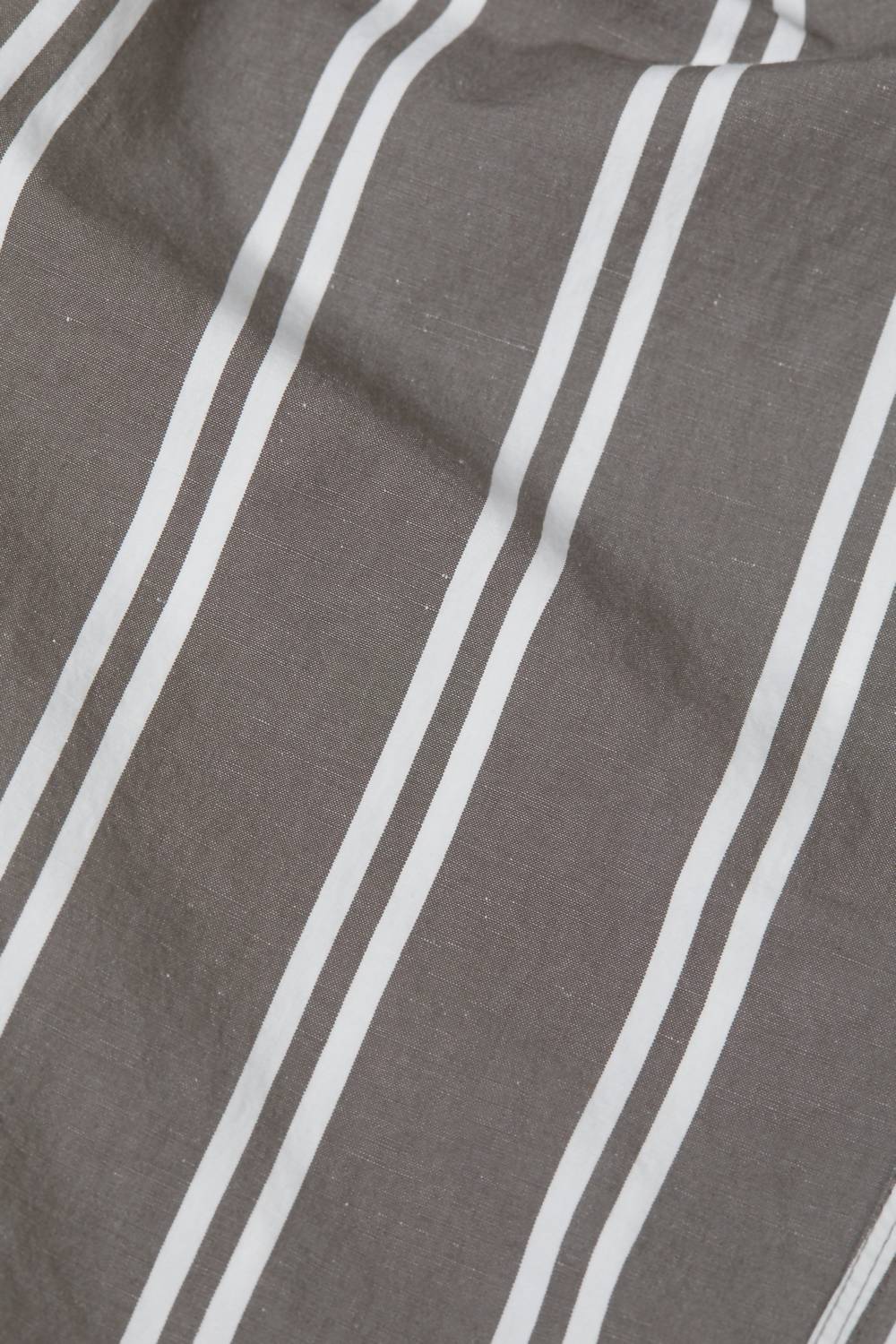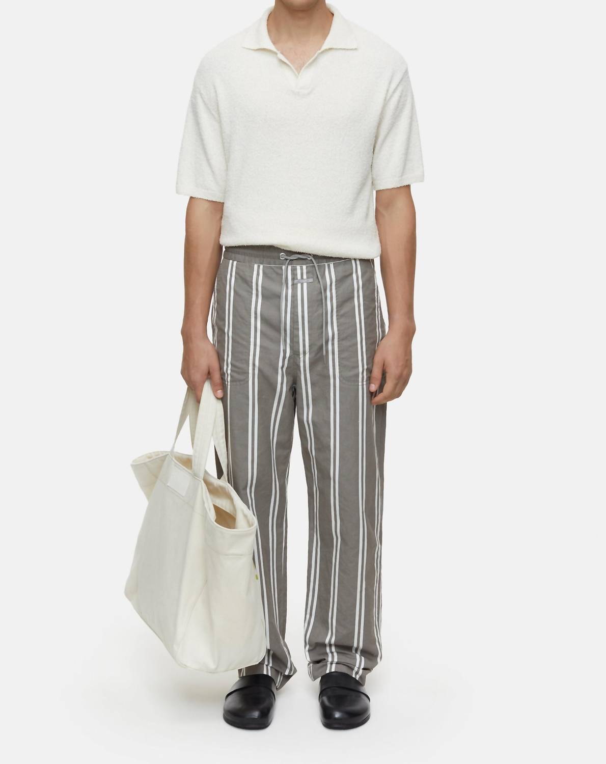 Introducing the Men's Samsun Wide Pants by CLOSED in a sophisticated chalk grey stripe, ideal for travel and New Year's Eve occasions. These pants feature a relaxed fit with a mid-rise and wide leg style, crafted from a cotton blend of 65% cotton and 35% linen. Made in Turkey from Italian fabric, they include convenient slit pockets and a buttoned welt pocket, with a pull-on closure for ease. Care includes machine wash, ensuring these pants remain a durable addition to your fall wardrobe. Inner leg length is approximately 72 cm / 28.34 inches, with a front rise of 33 cm / 12.99 inches. Model is 6'1" and wears size 32/32.