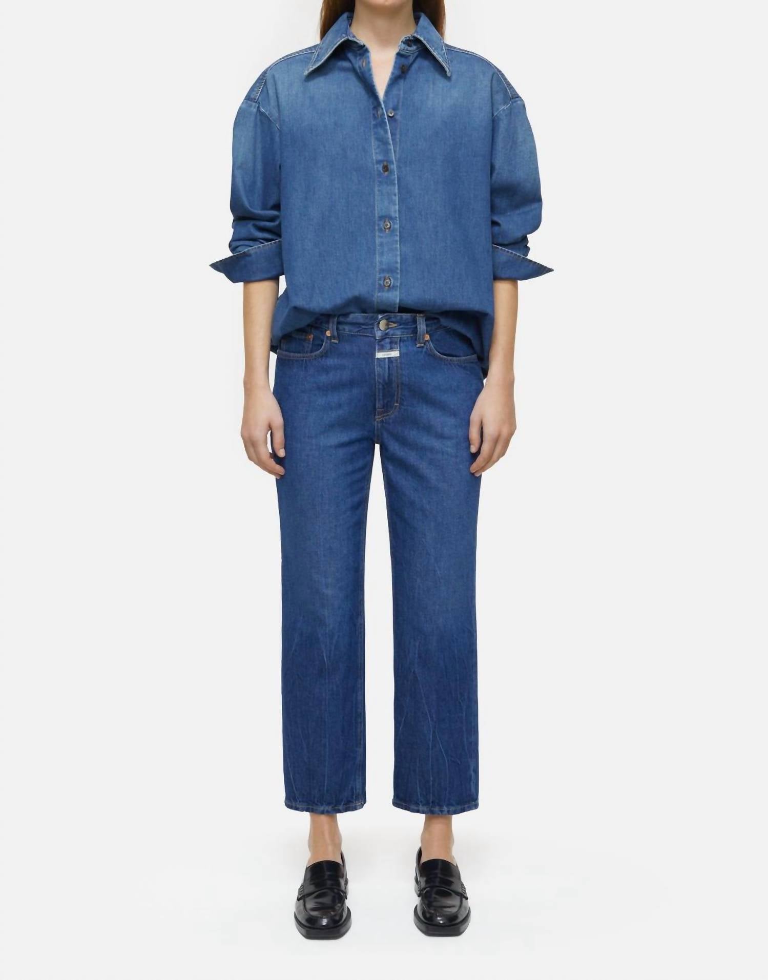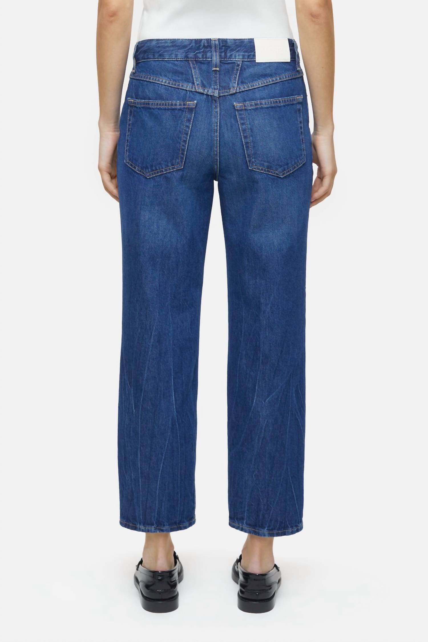 Just as cute as they are comfortable. Introducing the Milo Mid-waist Jean by CLOSED, a chic addition to your wardrobe crafted from strong Italian denim. These women's jeans feature a mid-rise, relaxed fit, and a stylish wide leg with a dark blue wash, perfect for streetwear or vacation looks. With a button closure, this denim is part of the eco-friendly A BETTER BLUE line, incorporating post-consumer cotton. Made in Italy, the fabric weighs in at 12.9 oz., promising durability and a unique dry feel that improves over time. The model is 5'9" and is wearing a size 27/32 with an inner leg length of approximately 67 cm (26.3 inches).