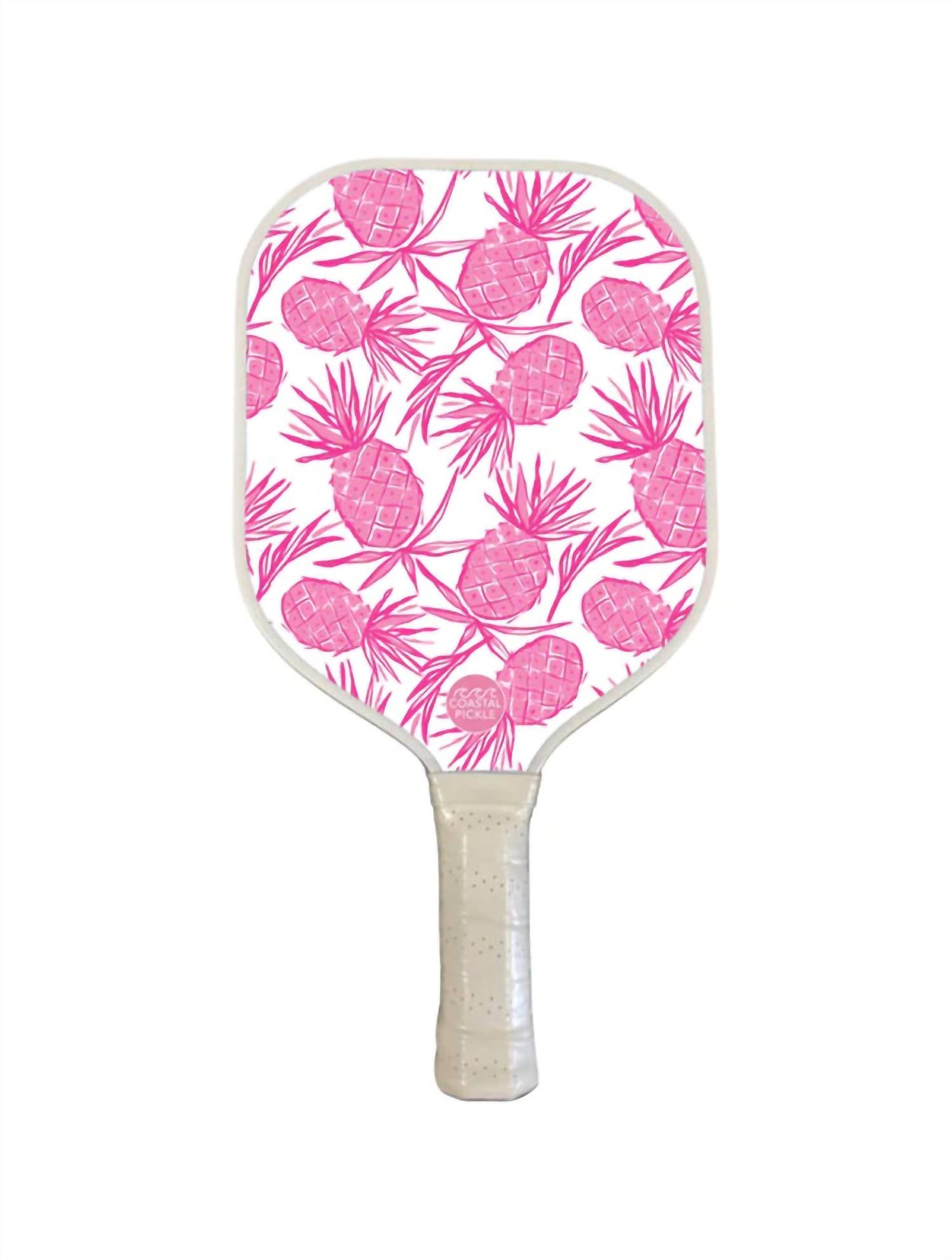 Introducing the Pineapple Punch Pickleball Paddle by Coastal Pickle, a vibrant addition to any game with its playful pink and white design. This paddle features a durable polypropylene core and a sleek graphite finish, ensuring quality and performance. Its widebody design measures 15.75" x 8", with a grip handle of 5" for comfortable use. Weighing between 8.0 and 8.2 oz, it's perfect for those seeking a tropical flair on the court.