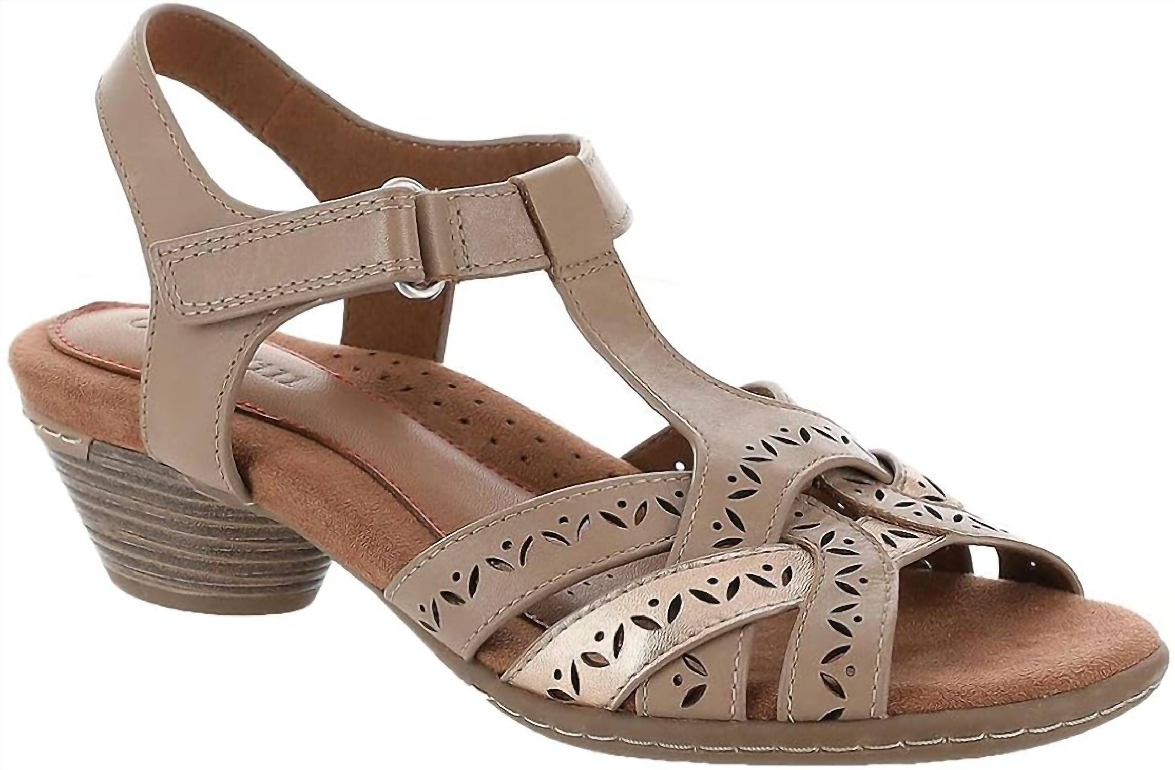 Designed for both style and support, this sandal features a genuine leather upper with subtle perforated detailing for added breathability. The adjustable hook-and-loop closure ensures a secure and customizable fit. A cushioned footbed delivers exceptional arch support, making it ideal for all-day wear. Finished with a lightweight thermoplastic rubber sole and a 1-3/8" cone-shaped heel, this sandal offers a comfortable lift with everyday versatility.