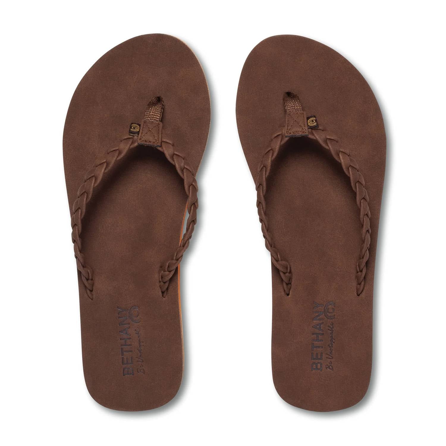 Flowy dresses, cropped pants, and even jumpsuits... this sandal works with them all! Introducing the Women's Bethany Braided Pacifica Sandal by Cobian, a chic blend of casual surf style and unparalleled comfort in a rich chocolate hue. Designed with a comfortable braided synthetic leather strap and a synthetic leather top sole, these sandals provide full arch support to keep you at ease all day. The open-toe design sits on a flat heel, featuring Cobian's EVA outsole and Bethany's inspiring 'Be Unstoppable' footbed logo. These stylish sandals are perfect for adult women who value both fashion and function.