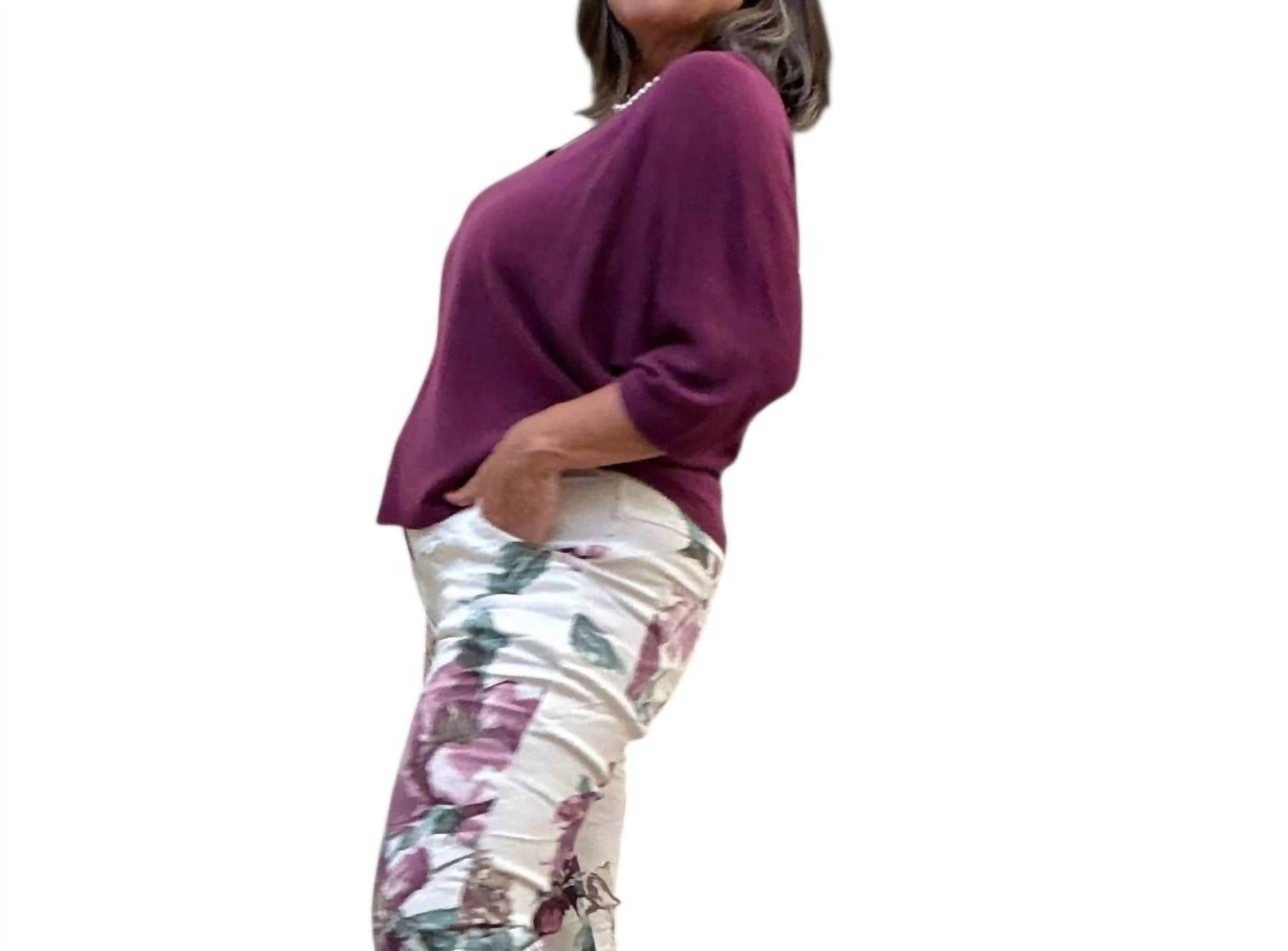 Indulge in the Women's Fine Knit Bat Sleeve Sweater by Cocco Bello, a chic addition to your wardrobe in a rich chocolate hue. Crafted with three-quarter bat sleeves, this solid sweater offers both sophistication and comfort, perfect for any vacation or streetwear trend. Composition: 55% Acrylic, 45% Modal. Country of origin: Made in Italy. Care: Machine wash. Designed in one size to fit most from S to XL, this piece beautifully combines versatility and timeless style with its flattering V-neck design.
