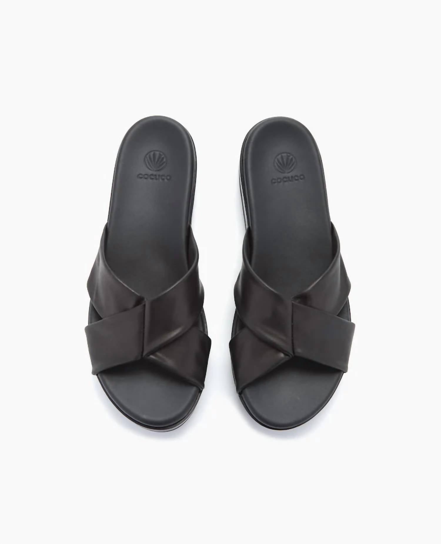 Flowy dresses, cropped pants, and even jumpsuits... this sandal works with them all! The Women's Dot Sandals by Coclico are crafted from supple black leather, featuring broad, artfully folded straps for a sculptural look and secure fit. Perfect for your summer wardrobe, these minimalist sandals are designed with a round toe and a flat heel under 1 inch. The lightweight flatform wedge and unique flex grooves in the sole offer enhanced flexibility, making them ideal for vacation season. Elevate your style with comfort and ease, embracing a modern essential that doesn't compromise on comfort.