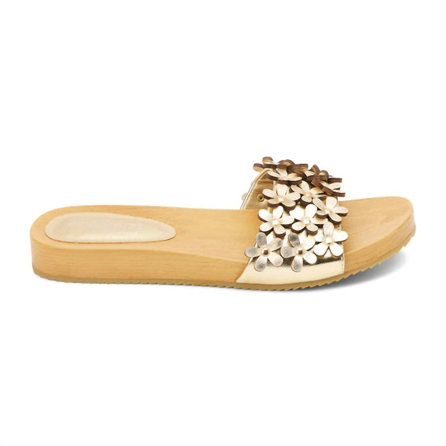 Flowy dresses, cropped pants, and even jumpsuits... this sandal works with them all! Step into summer elegance with the Women's Chelsea Sandal by Coconuts by Matisse, featuring a chic vegan one-band design adorned with flower appliqué in a radiant gold hue. These sandals boast a synthetic leather upper and lining, complemented by a comfortable padded insole and a manmade outsole. With a flat heel height of 1 inch (2.54 cm) and an easy slip-on style, they provide both style and convenience for any summer occasion. Crafted for minimalist allure, these sandals are imported and are perfect for your next dinner party.