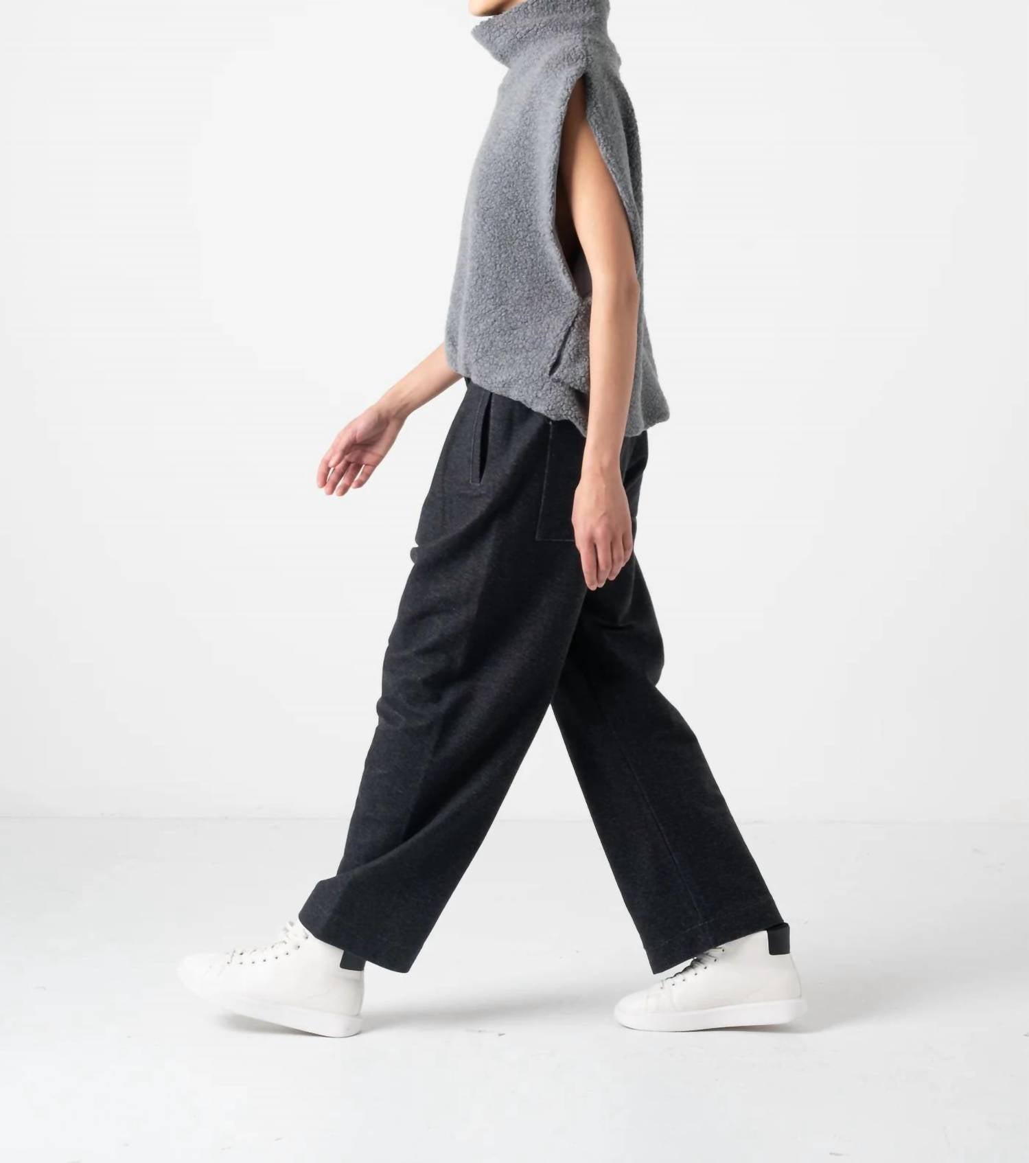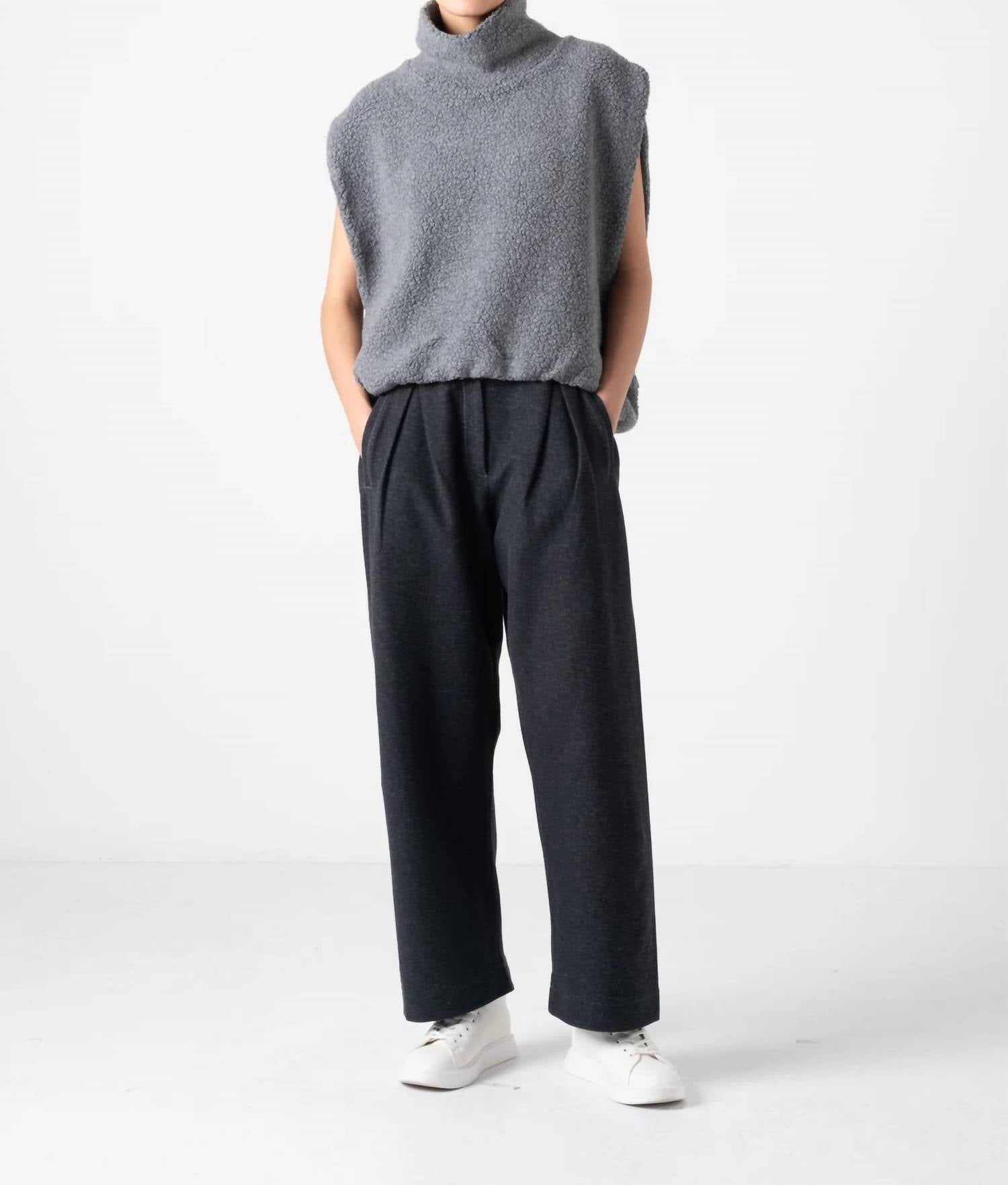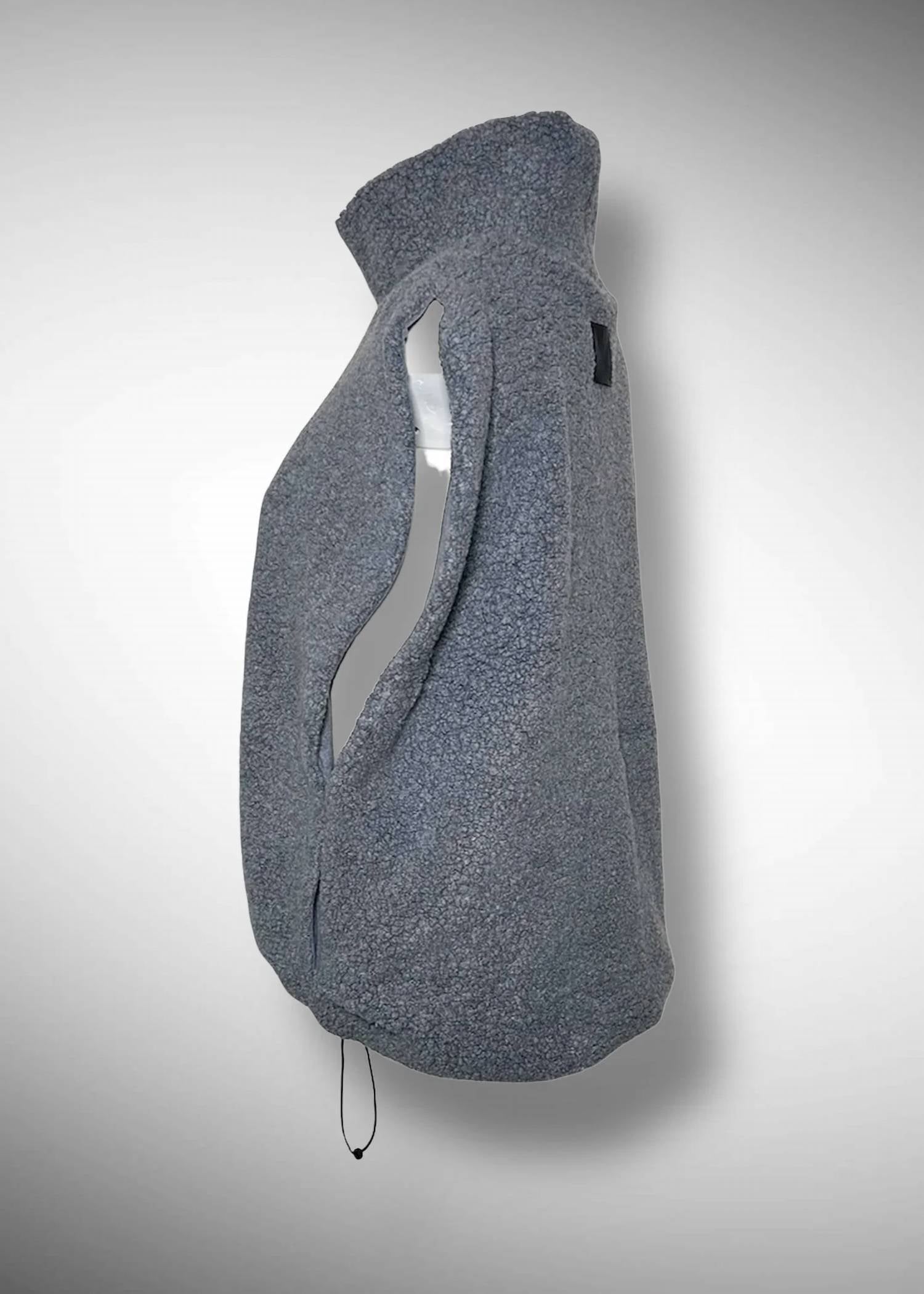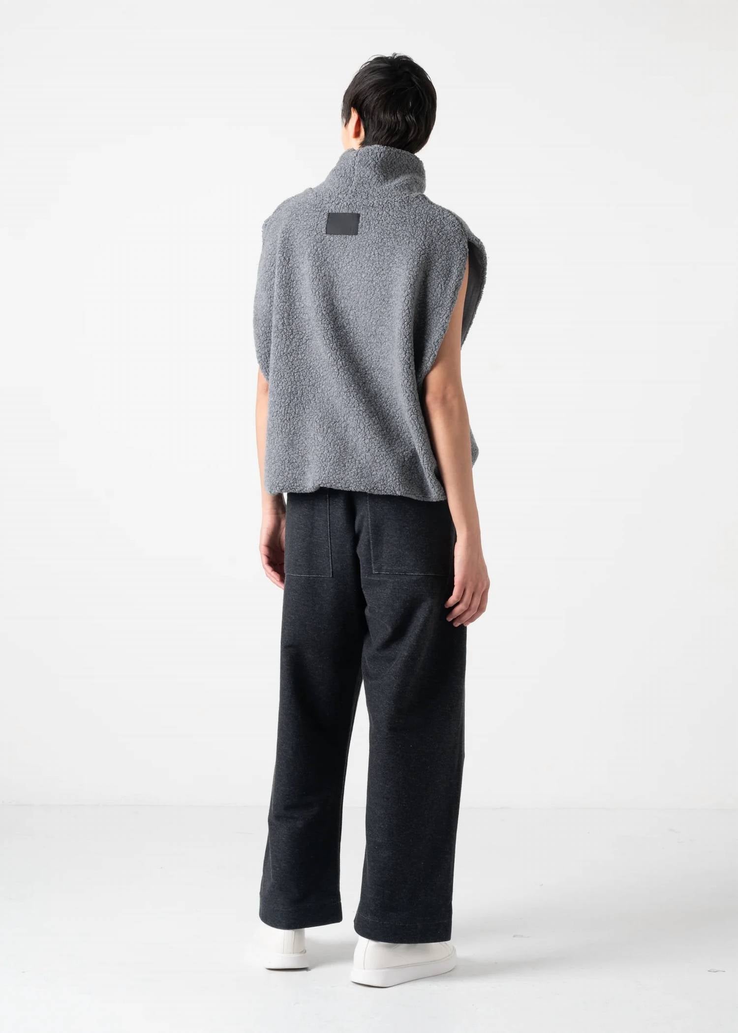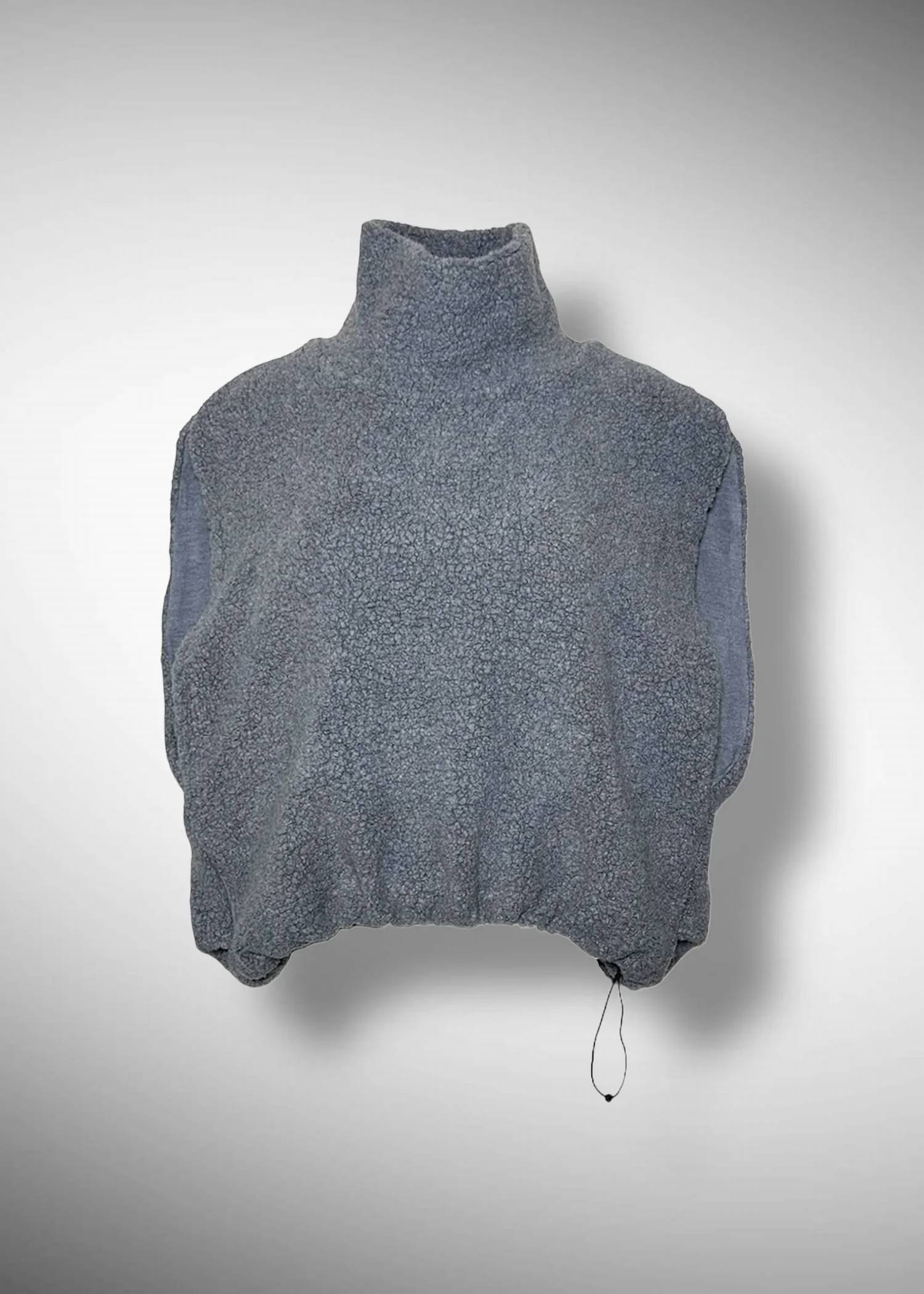 Discover the Krystal High Neck Sheep Pile Gilet by COG The Big Smoke, a minimalist piece in textured gray designed to elevate your winter wardrobe. This sleeveless vest is crafted from a wool blend, featuring a stylish turtleneck and elasticated adjustable hem, offering a voluminous, three-dimensional silhouette. Made in Japan, each short-length gilet measures 24.5 inches and offers a smooth, soft jersey lining with side and slash pockets for added functionality. Closure: Pull on. Care: Dry clean only, perfect for travel and versatile layering in the colder months. Face: Wool 60% Nylon 40%. Back side: Acrylic 49% Rayon 43% Polyurethane 8%.