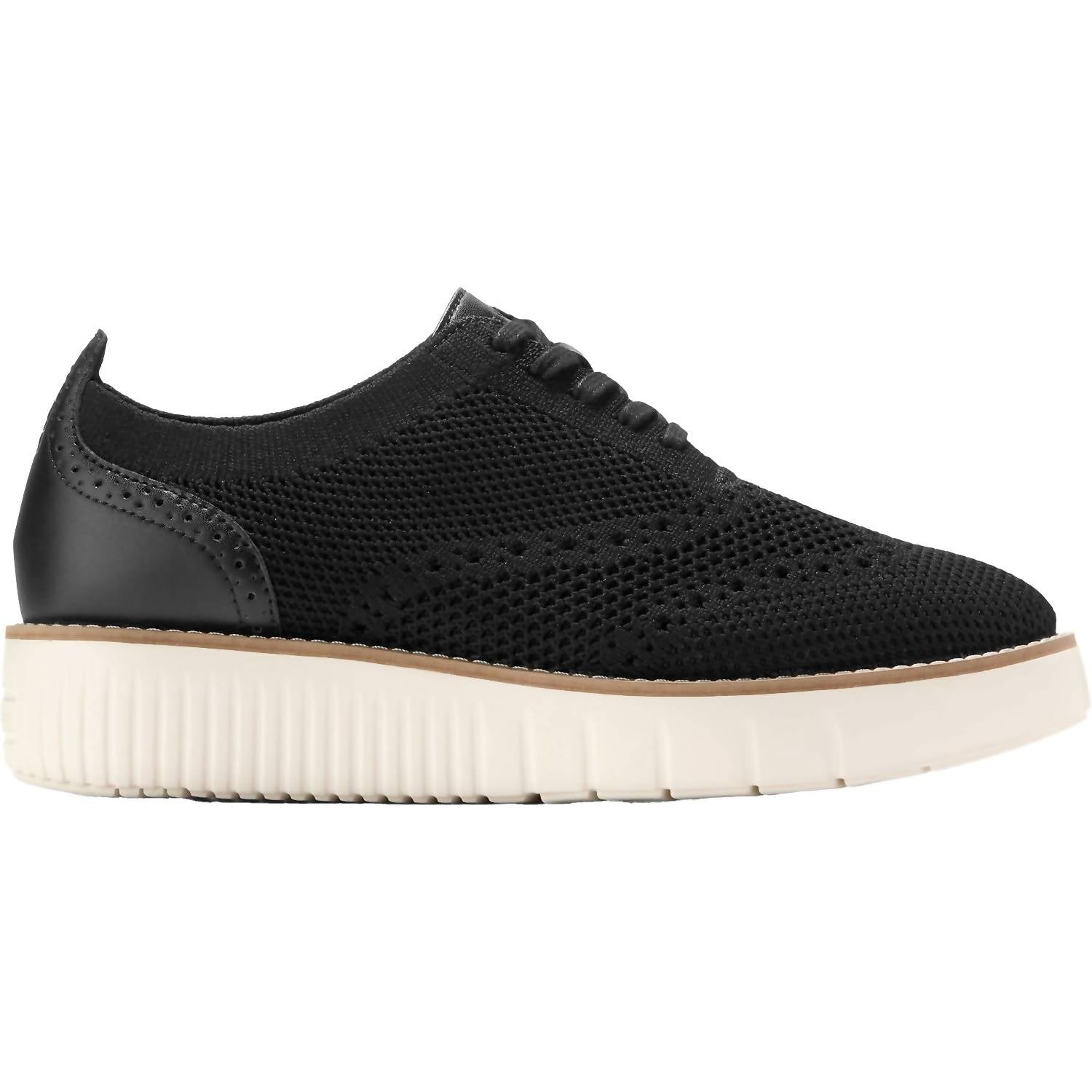 Elevate your style with the Cole Haan Women's Grand City Platform Stitchlite Oxford Sneakers, a perfect blend of fashion and comfort. These black knit shoes feature a breathable Stitchlite™ upper with a classic four-eyelet lacing system, ideal for versatile styling from office to casual outings. The innovative FlowerFoam™ midsole, made with at least 25% dandelion rubber, provides a cushioned step and a sustainable choice. With platform soles ranging from 0.5 to 1.3 inches, these sneakers offer a subtle height boost, all while maintaining a comfortable medium width and round toe design.