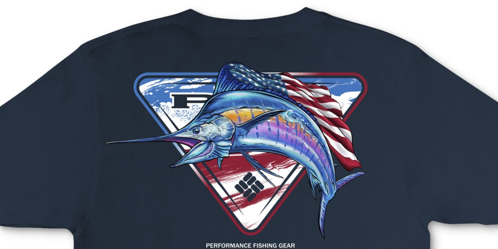 Columbia Perfomance Gear takes on Americana featuring a standout Marlin jumping out of the triangle.| Crew Neck| Graphic Tee| Short Sleeve| Classic fit | Cotton| Machine washable