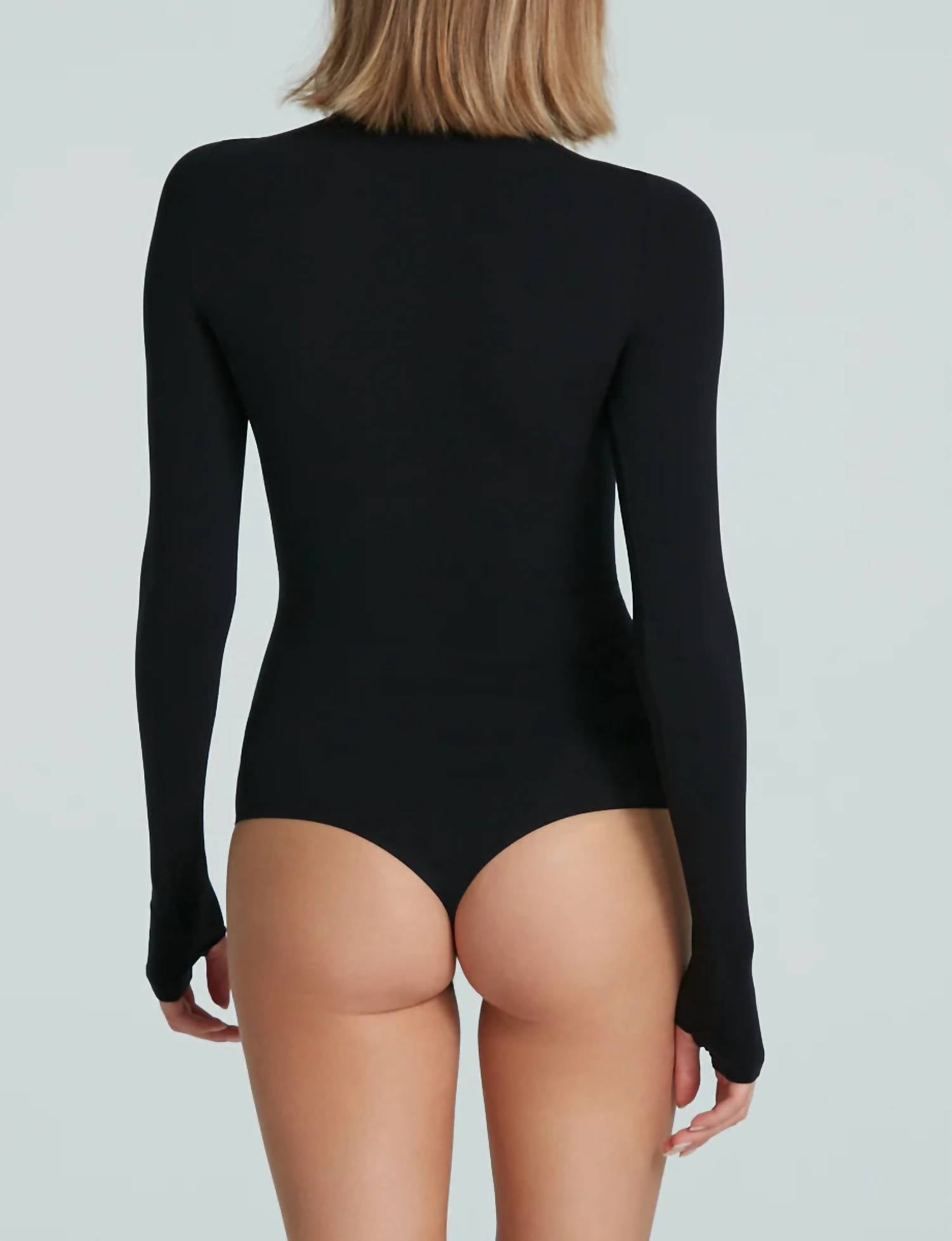 Form fitting and comfortable - this bodysuit check all of the boxes. Introducing the Commando x Jennifer Fisher Ballet Turtleneck Bodysuit, a chic addition to your workout wardrobe. This black long sleeve bodysuit is crafted in a luxury microfiber blend of 87% nylon, 12% elastane, and 1% cotton, featuring a seamless construction for superior body contouring and endless stretch. It offers a customizable turtleneck for personalized styling and is designed with a raw-cut thong bottom and snap gusset closure. Care for this versatile piece with machine wash and lay flat to dry, ensuring it remains a staple through countless workouts and seasons.