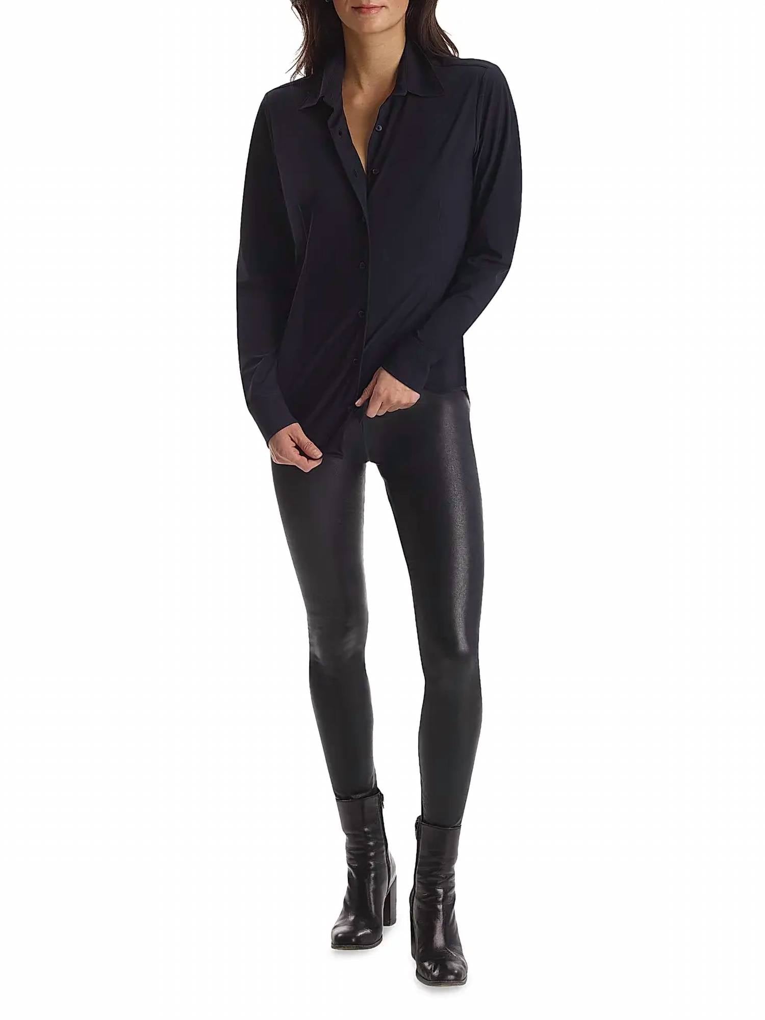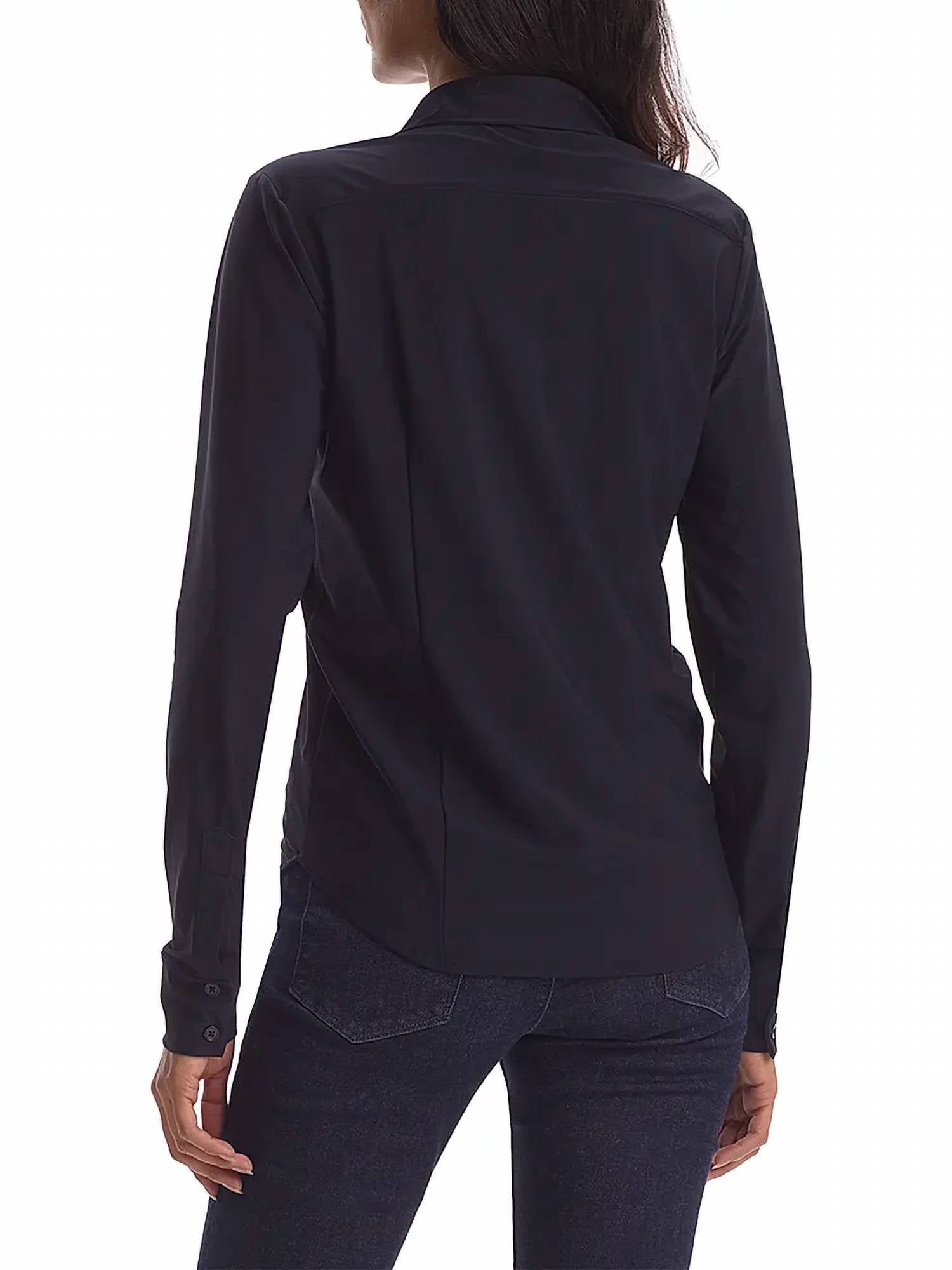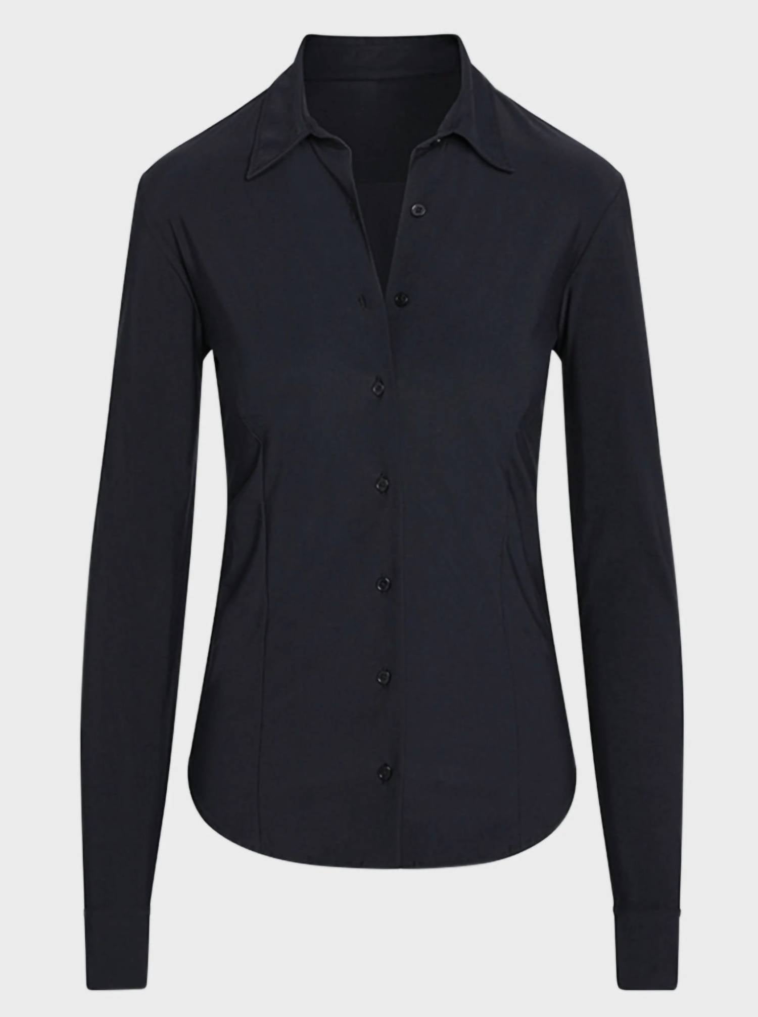 This button down shirt is comfortable yet polished. Embrace effortless sophistication with the Commando Classic Button Down Shirt, thoughtfully crafted for the modern woman. This versatile piece in stylish black features long sleeves with button cuffs and a flattering fitted silhouette. Made from a luxe nylon blend of 78% nylon and 22% elastane, this shirt is machine washable, offering both comfort and convenience. Proudly made in the USA from imported materials, it showcases a classic oxford design that effortlessly complements any wardrobe. Model is 5'10" and wears a size small.