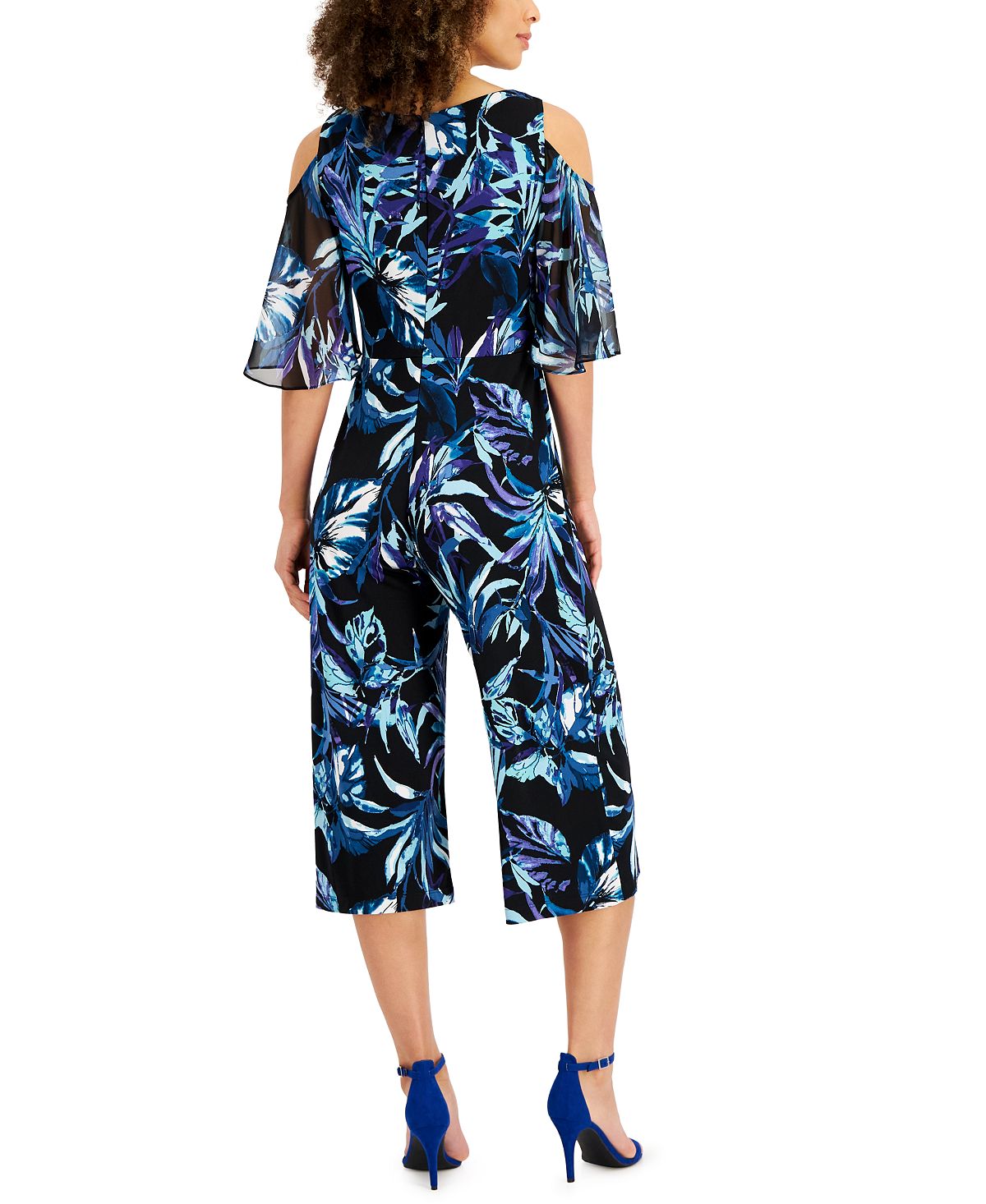 Vacation or weekend ready| this soft| stretchy jumpsuit from Connected features a gorgeous print and cold-shoulder cutouts.| Approx. inseam; 20| Jersey-knit; Soft and stretchy| Round neckline; back zipper closure| Cold-shoulder cutouts