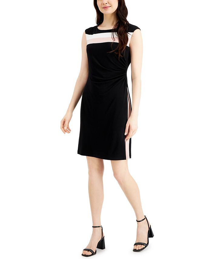 Colorblocked accents elevate a classic sheath silhouette on this sleek petite dress from Connected.| Approx. 37 long from center back neck to hem. Length is based on size 8P and varies 1/4 between sizes| Tailored fit through the chest| waist| and hips; sits close to the body| Jersey-knit; Soft and stretchy| Designed to fit and flatter 5'4 and under frame