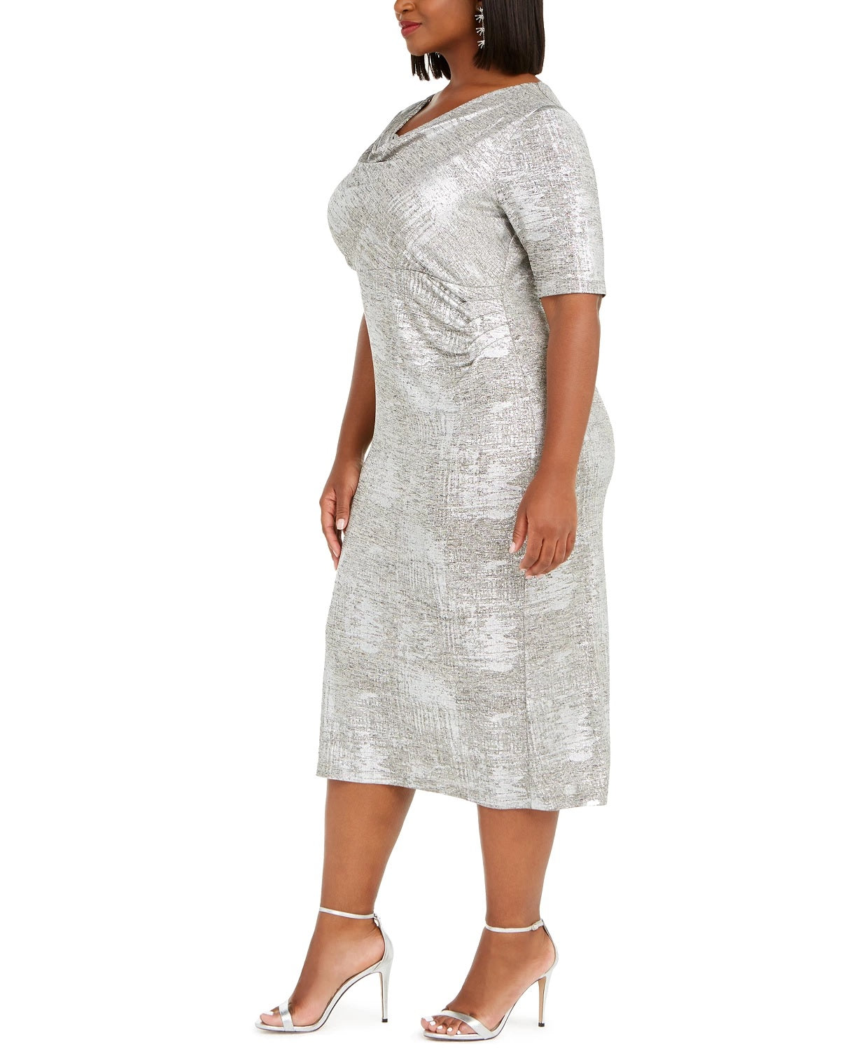 Connected Women's Cowlneck Metallic Midi Dress Silver Size 14W