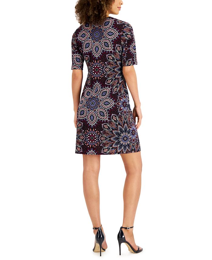 Keep your look current in this petite sheath dress from Connected designed with gleaming O-ring hardware at the waist.| Approx. 37 long from center back neck to hem. Length is based on size 8P and varies 1/4 between sizes| Tailored fit through the chest| waist| and hips; sits close to the body| Jersey-knit; Soft and stretchy| Designed to fit and flatter 5'4 and under frame