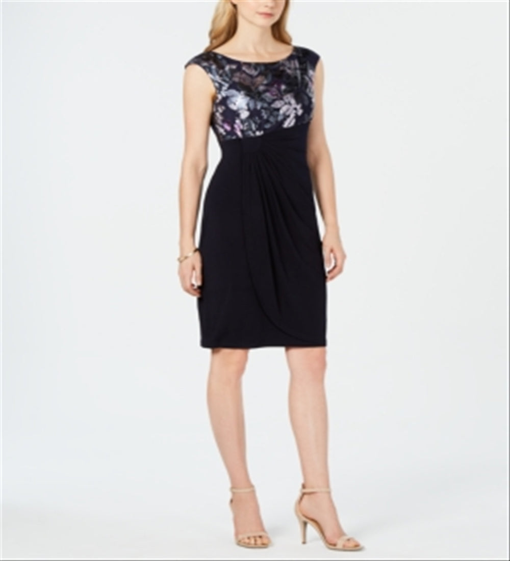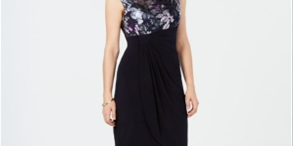a metallic floral print accents the bodice of this petite sheath dress dress from connected| designed in faux-wrap style and a graceful round neckline