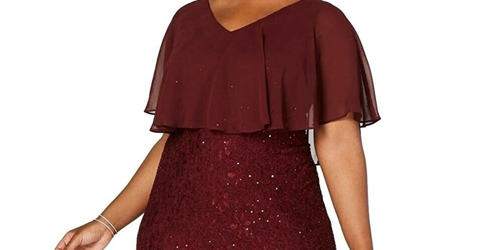 Approx. 58" long from center back neck to hem. Length is based on size 18W and varies 1/4" between sizes|V-neck with chiffon overlay|Pull-on styling|Allover sequined lace|IMPORTANT NOTE: This item arrives with a return tag attached and instructions for removal. Once the tag is removed from the dress, this item cannot be returned.