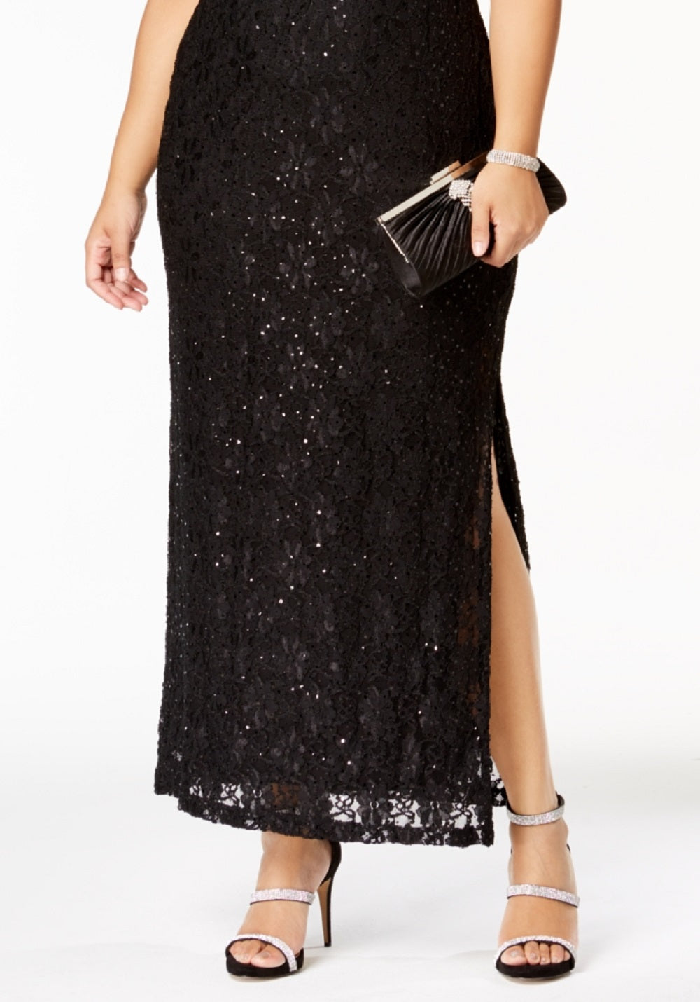 Connected's dazzling plus size gown is designed in gorgeous lace with sparkling sequins throughout and finished in a luxuriously long floor length for added coverage.| Funnel neckline| Allover sequined lace; side slit| Pullover styling| Floor length| Imported|