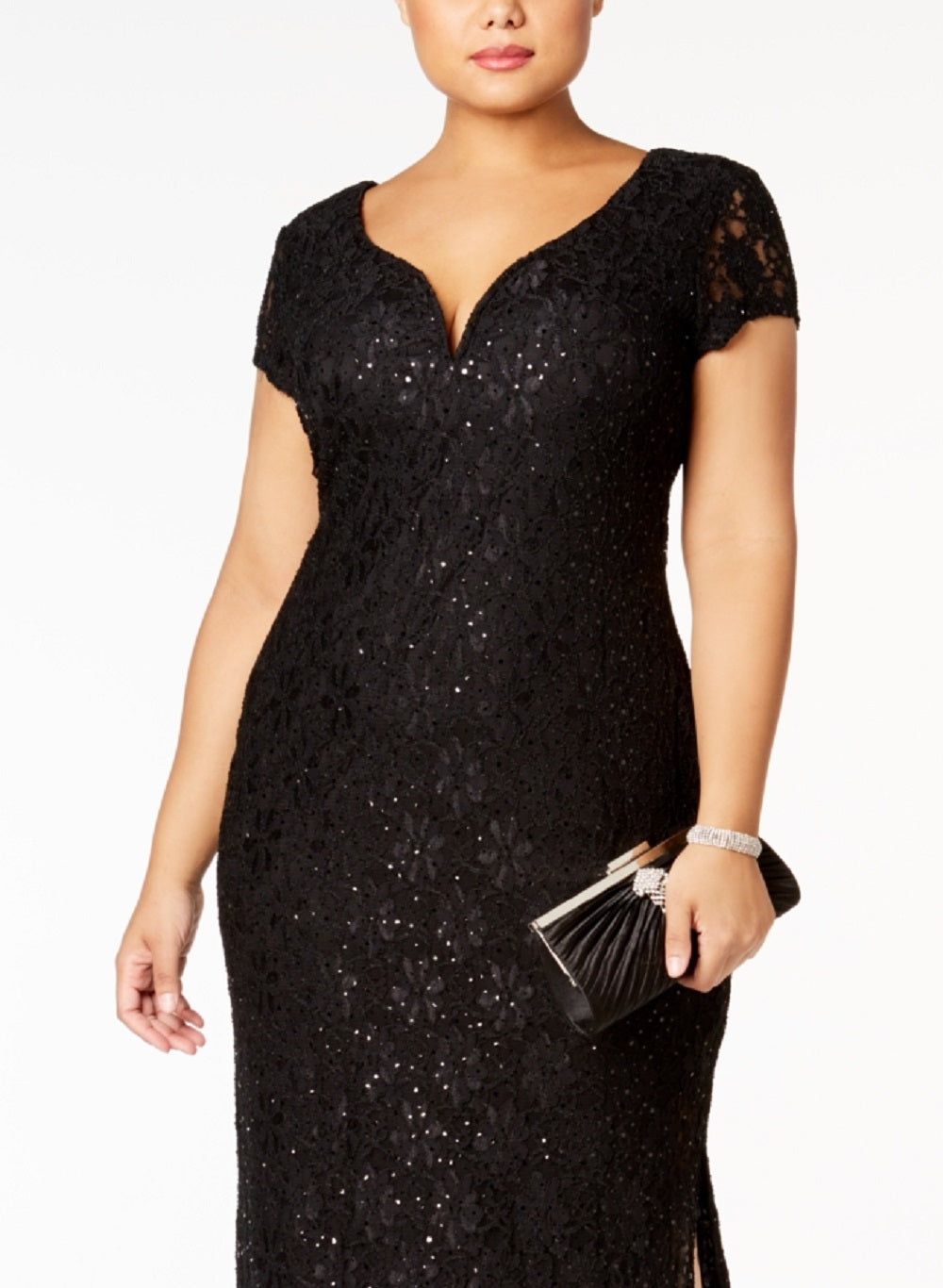 Connected's dazzling plus size gown is designed in gorgeous lace with sparkling sequins throughout and finished in a luxuriously long floor length for added coverage.| Imported| Funnel neckline| Floor length| Pullover styling| Allover sequined lace; side slit|